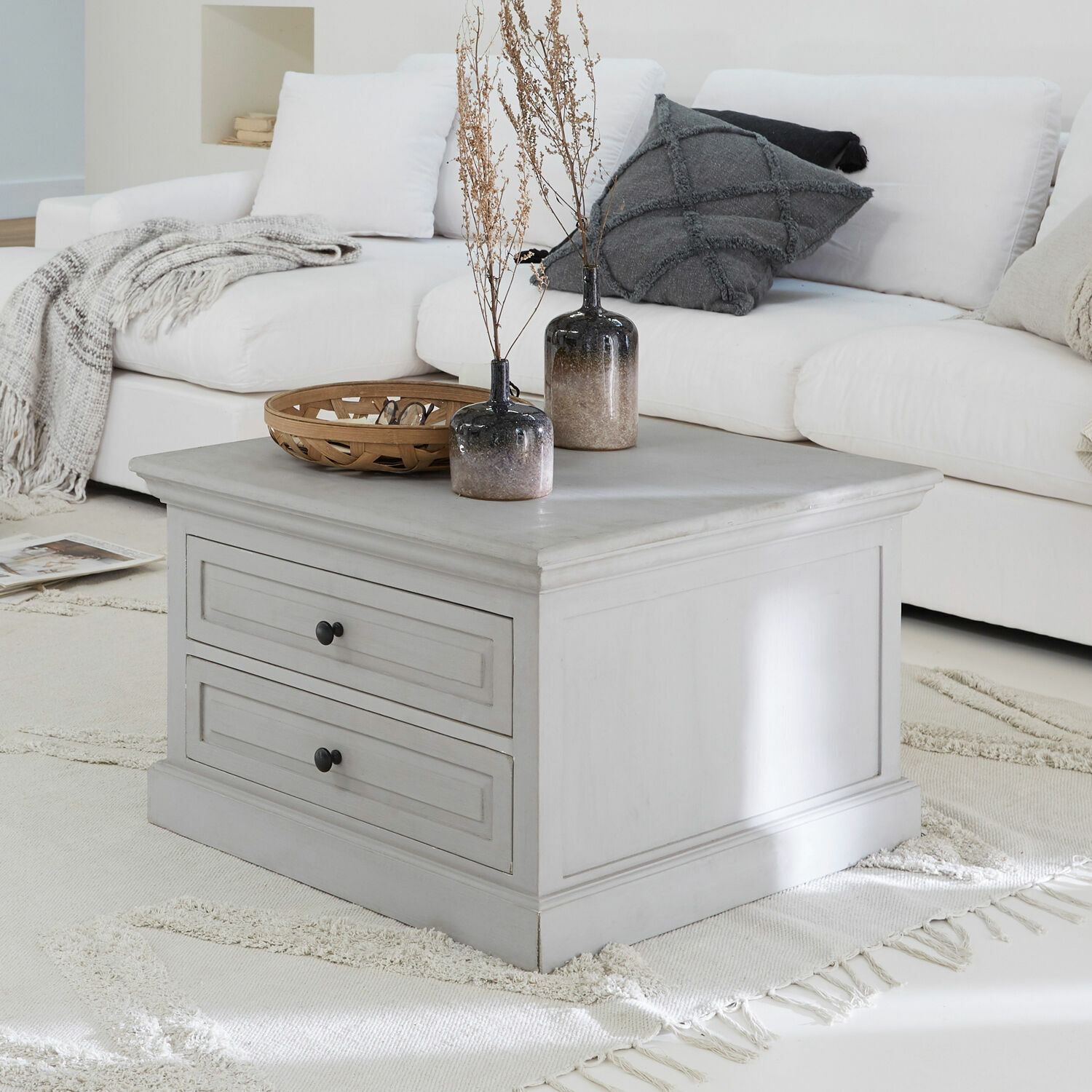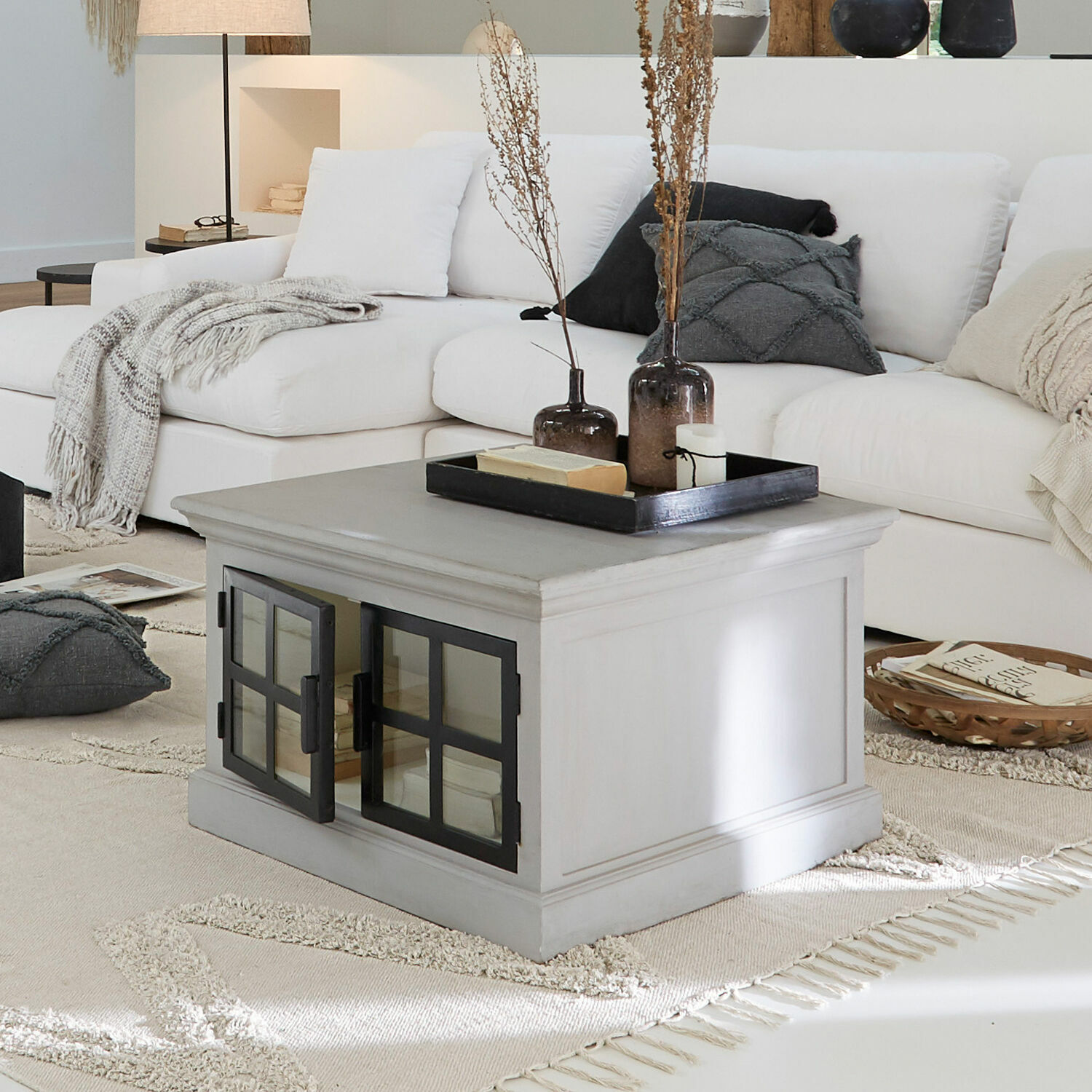Wie man es auch dreht und wendet – dieser Couchtisch hat definitiv mehr als eine Schokoladenseite. Eigentlich sogar vier. Denn zwei Seiten sind mit den landhaus-typischen Profilleisten verziert, die zusammen mit dem massiven Sockel und dem hübschen Kranzprofil den Tisch zu einer kleinen Augenweide im Raum machen. Das Besondere aber, das diesen Couchtisch von vielen seiner Kollegen unterscheidet, sind die beiden anderen Seiten. Von Vorder- und Rückseite mag man hier ja nicht reden. Da ist zum einen die Seite mit den zwei kassettierten Schubladen, in denen Sie alles verstauen können, was Sie neben dem Sofa gerne griffbereit haben wie Fernbedienung, TV-Zeitung und Co. Und da ist zum anderen die Seite mit dem Stauraum hinter den zwei Glastüren, die mit schlichten Eisensprossen stilvoll verziert sind und die sich besonders gut für stimmungsvolle Dekorationen anbieten. Ob Ihnen bei diesem Couchtisch die Ansicht mit den Glastüren oder die mit den Schubladen besser gefällt, müssen Sie entscheiden. beide aber sind sorgfältig und nach bester Handwerkskunst aus hochwertigem Buchenholz gefertigt und mit einem Antik-Finish versehen, zu dem das Eisen einen hübschen Kontrastpunkt setzt.