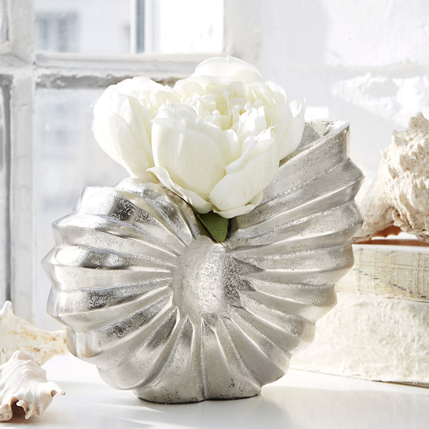 Dieser stilvolle Ammonit wirkt beinahe wie ein antikes Fundstück aus dem Meer. Er besteht aus silbrig glänzendem Aluminium mit moderner urbaner Oberfläche. Das Beste: Sie werden darauf nie unschöne Fingerabdrücke sehen. Lästiges Putzen und Polieren entfällt. Ob als Solo-Schmuckstück oder als kleiner Pflanztopf: Setzen Sie mit diesem Accessoire geschmackvolle Akzente mit einem Hauch Maritim-Flair. Es passt sich jedem Wohnstil wunderbar an, ob modern, antik, Shabby-Chic, romantisch oder Landhaus-Stil. In Badezimmer, Wohnräumen, auf einer Anrichte im Flur oder auch auf dem Nachttisch im Schlafzimmer erfreut der Ammonit das Auge. Unser Tipp: Arrangieren Sie doch einige Muscheln um ihn herum – so kommt das Gefühl eines Tages am Strand auf ausgesprochen elegante Art und Weise zu Ihnen nach Hause. Auch eine schöne und sehr individuelle Geschenkidee für stilbewusste Freunde