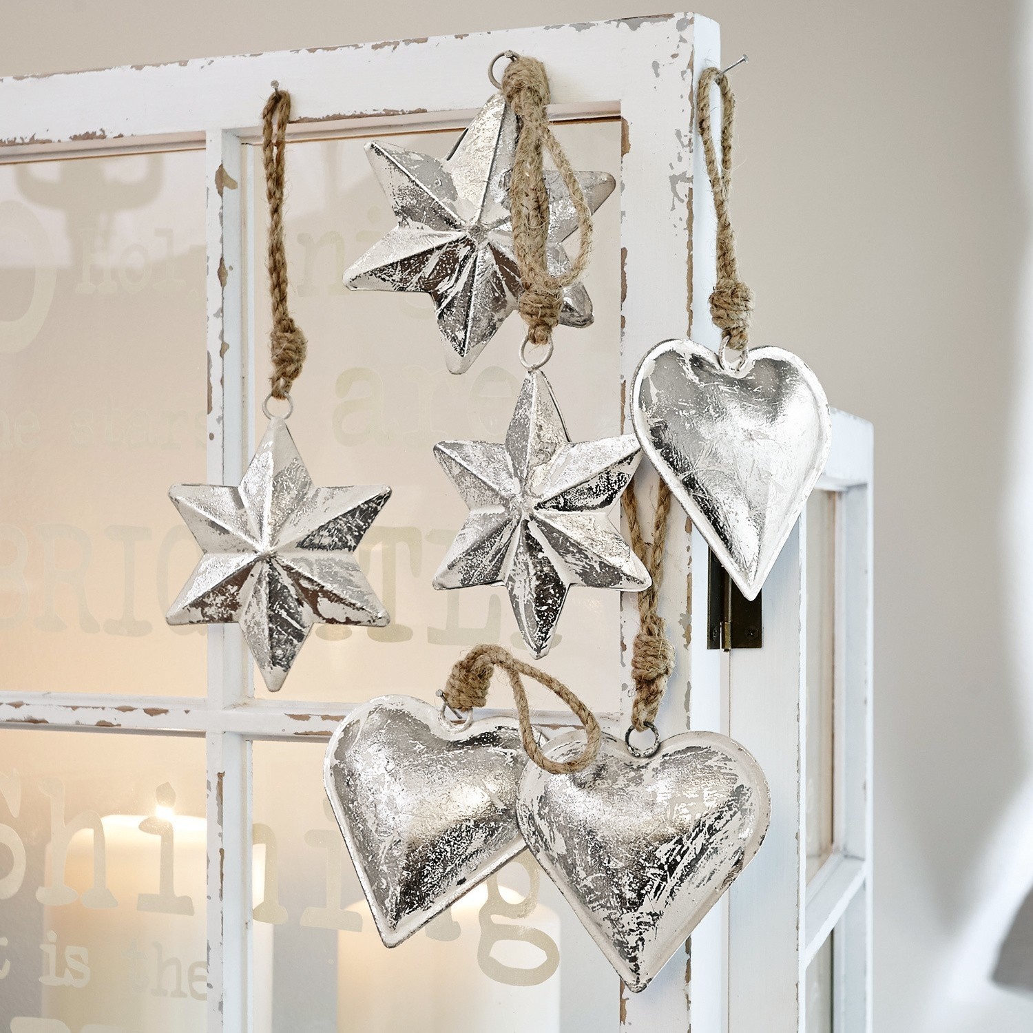 Dieses bezaubernde Set erfüllt jeden Raum mit seinem festlichen Charme. Je drei Sterne und drei Herzen sind mit natürlich schönen Jutekordeln besetzt und lassen sich gemeinsam oder einzeln in Ihrem Zuhause verteilen. Die filigranen Schmuckstücke wurden aus reinem Eisen geformt und in einem aufwendigen Prozess antikveredelt. Der raffinierte Glanz kontrastiert perfekt mit der natürlichen Anmutung der feinen Kordeln.
