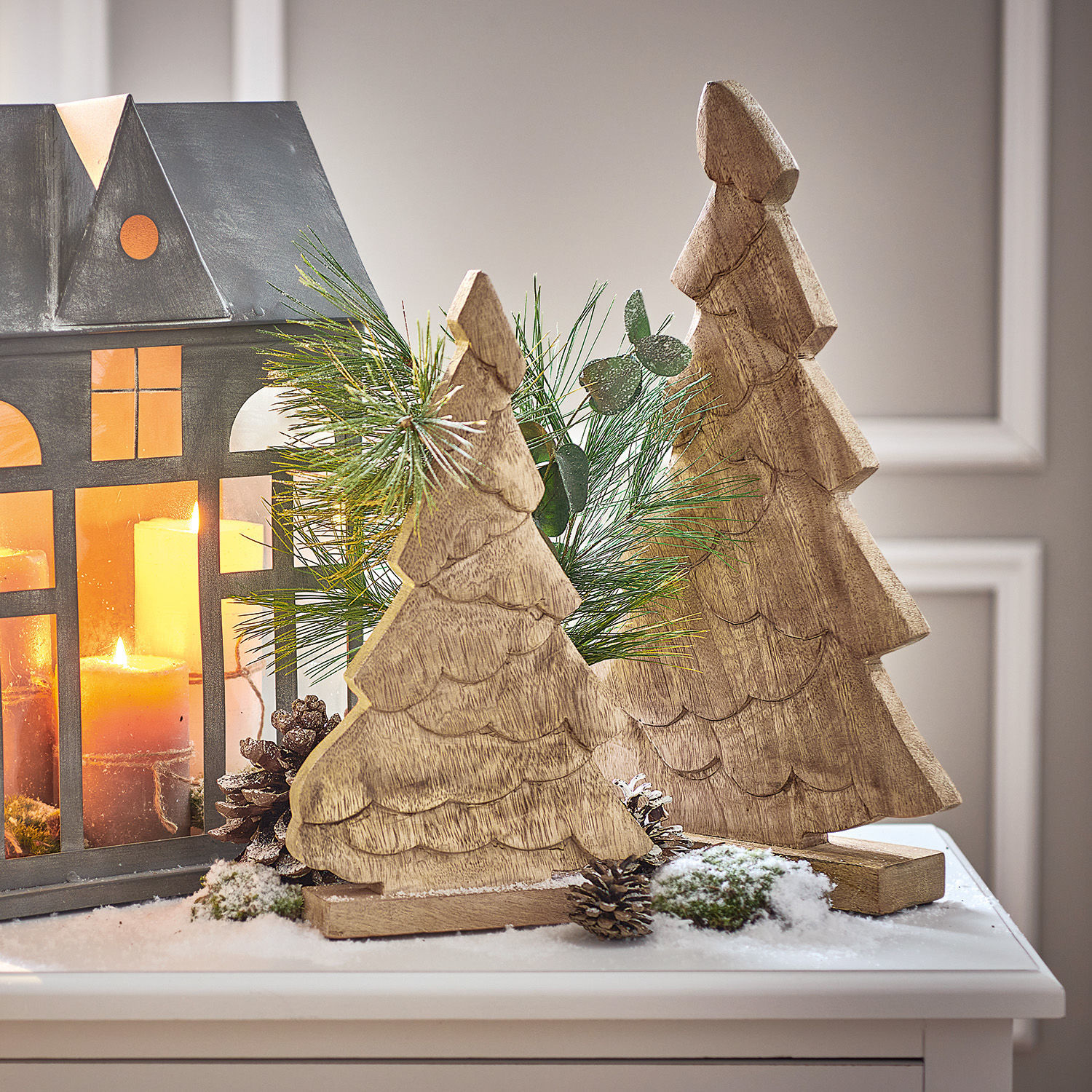 Einen sehr naturnahen Akzent zum Fest setzt dieses schöne Doppel. Im Set sind zwei dekorative Tannen enthalten, die aus edlem Mangoholz gefertigt sind. So erhalten Sie ein hochwertiges reines Naturprodukt mit attraktiver Anmutung. Zwei unterschiedliche Größen sorgen für einen reizvollen optischen Effekt. Ein Hauch Chalet-Stil kommt damit in Ihre Weihnachtsstube, und auch zu Landhaus-Wohnwelten und dem Country-Stil passen die formschönen Holzbäumchen wunderbar. Stellen Sie sie einfach auf und dekorieren Sie auf Wunsch noch Kerzen, Lichterketten und Wintergrün dazu. Fertig ist ein heimeliger und rustikaler Schmuck für die Feiertage. Praktisch, wenn der Winterwald einfach zu Ihnen nach Hause kommt, oder?