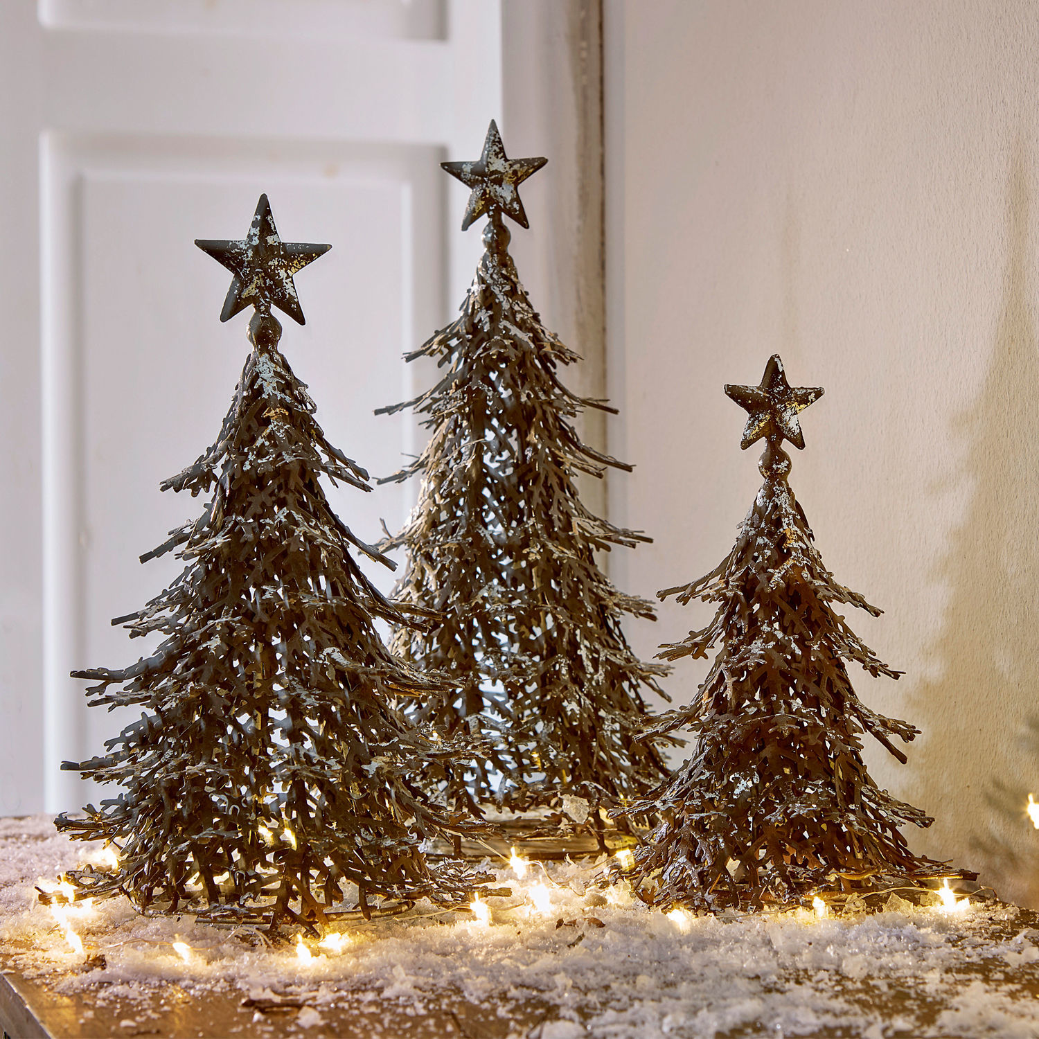 Drei zauberhafte kleine Bäumchen, die das Flair eines verschneiten Winterwaldes in Ihre Weihnachtsstube zaubern. Sie bestehen aus Eisen, das aufwendig und liebevoll gearbeitet wurde. Die Zweige sind besonders filigran gestaltet. Die rustikale Rost-Optik mit Antik-Finish spielt schön mit der feinen Silberbemalung zusammen, die den Anschein von Schneeglitzer auf den Tannen erweckt. Im Set erhalten Sie drei Größen, die sehr reizvoll als Grüppchen wirken. Doch auch solo setzen die Dekobäumchen stimmungsvolle Akzente. Ein weihnachtliches Set, das wunderbar zum Shabby-Chic passt. Auf den Spitzen der eisernen Tannen thront je ein Weihnachtsstern.