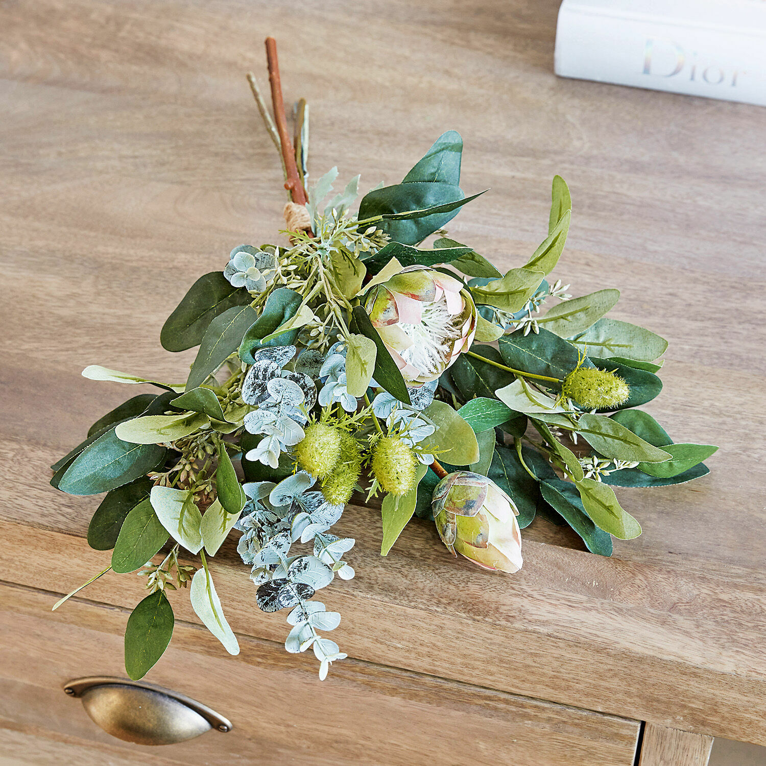 Genießen Sie das ganze Jahr über den Anblick wunderhübscher Blüten und Eukalyptusblätter – mit diesem reizenden Deko-Strauß ist das möglich. Er erscheint wirklich wie ein gerade frisch gebundenes Bouquet und bezaubert mit seiner sehr natürlichen Optik. Dabei bleibt dieser Strauß aber für immer frisch und welkt niemals – so sparen Sie es sich auch, immer wieder neu Blumen zu kaufen. Das kunstvoll drapierte Ensemble sieht sehr gut in einer dekorativen Vase auf dem Tisch oder auf einer Anrichte aus. Es schmeichelt jedem Wohnstil und verschönert das Wohnzimmer, Schlafräume oder auch Bad und Küche. Besonders zum Landhaus-Stil ist der stilvolle Strauß mit biegsamen Zweigen eine wunderbare Ergänzung.