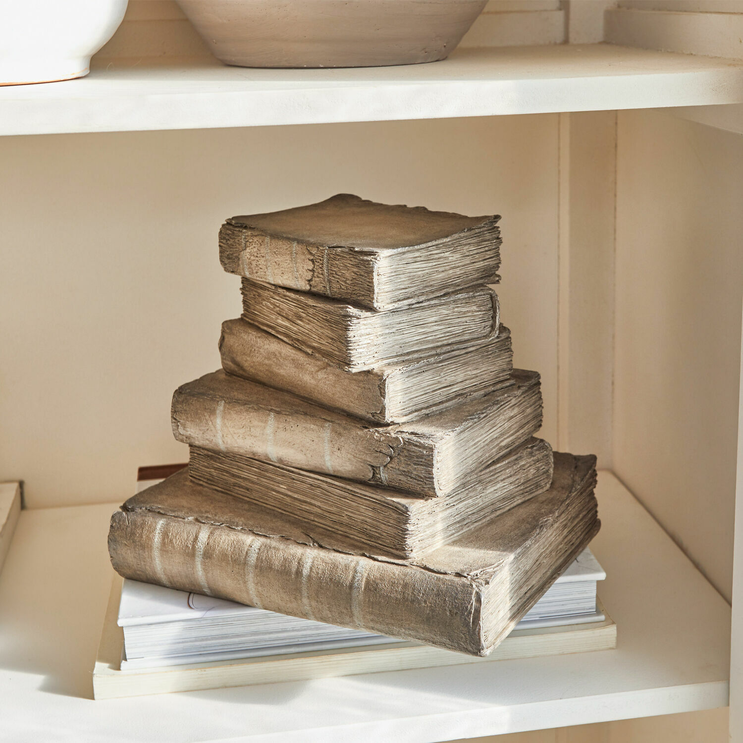 Dieses sehr charmante und außergewöhnliche Design begeistert alle Bücherliebhaber und Freunde des Nostalgischen. Die edle und realistische Polyresin-Nachbildung stellt einen Stapel antiker Bücher dar, der wirklich ganz echt erscheint. Verleihen Sie Ihren Räumen hiermit einen Hauch Vintage-Flair und setzen Sie gekonnte Akzente – vielleicht auf der Kaminkonsole platziert, im Regal oder auch als Schmuckstück auf einer Treppe in Innenräumen. Die Deko-Bücher sind fest miteinander verbunden. Sie erinnern an wertvolle Fundstücke von einem geheimnisvollen Speicher und regen die Phantasie an. Zumal machen sie auch gleich Lust auf Lesen, oder? Ihr Zuhause erhält hiermit eine sehr elegante und kultivierte Note. Wer möchte, könnte noch Dekoratives wie etwa eine hübsche Duftkerze obenauf platzieren.