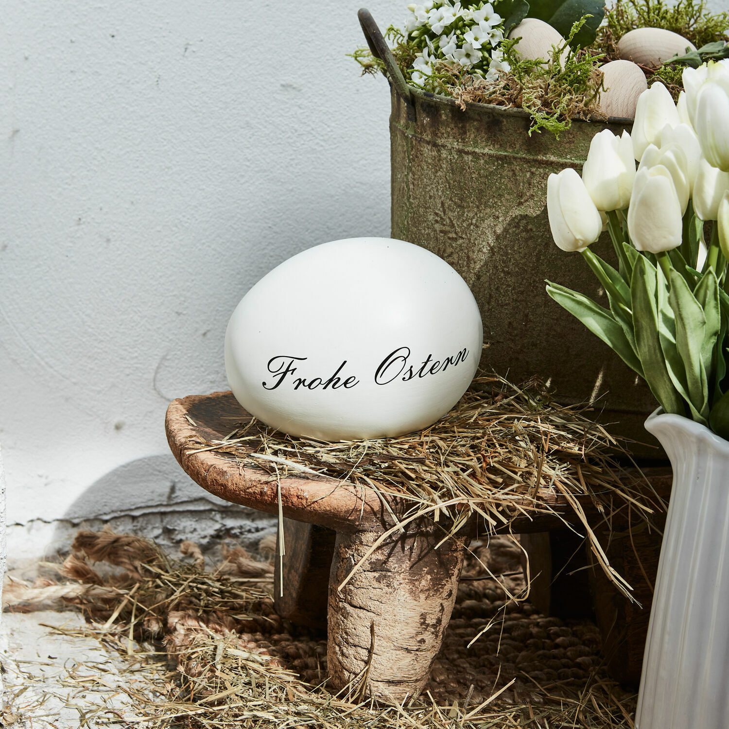 Lassen Sie sich und Ihren Gästen in der Osterzeit ein Lächeln ins Gesicht zaubern – diesem charmanten Deko-Ei aus Polyresin gelingt das im Handumdrehen. Es ist wunderhübsch von Hand beschriftet, wobei der edle Schriftzug romantisch geschwungen ist. So passt das stilsichere Design bestens zum Shabby-Chic. Es versprüht einen Hauch Nostalgie auf der Ostertafel und versteht sich auch mit weiterem Osterschmuck wunderbar. Dieses ansprechende Deko-Ei steht sicher auf der ebenen Unterseite, sodass es sich gut auf dem Tisch oder einer Kommode platzieren lässt. Freuen Sie sich immer wieder zum Osterfest darauf und geben Sie jedem Raum eine leicht verspielte Note.