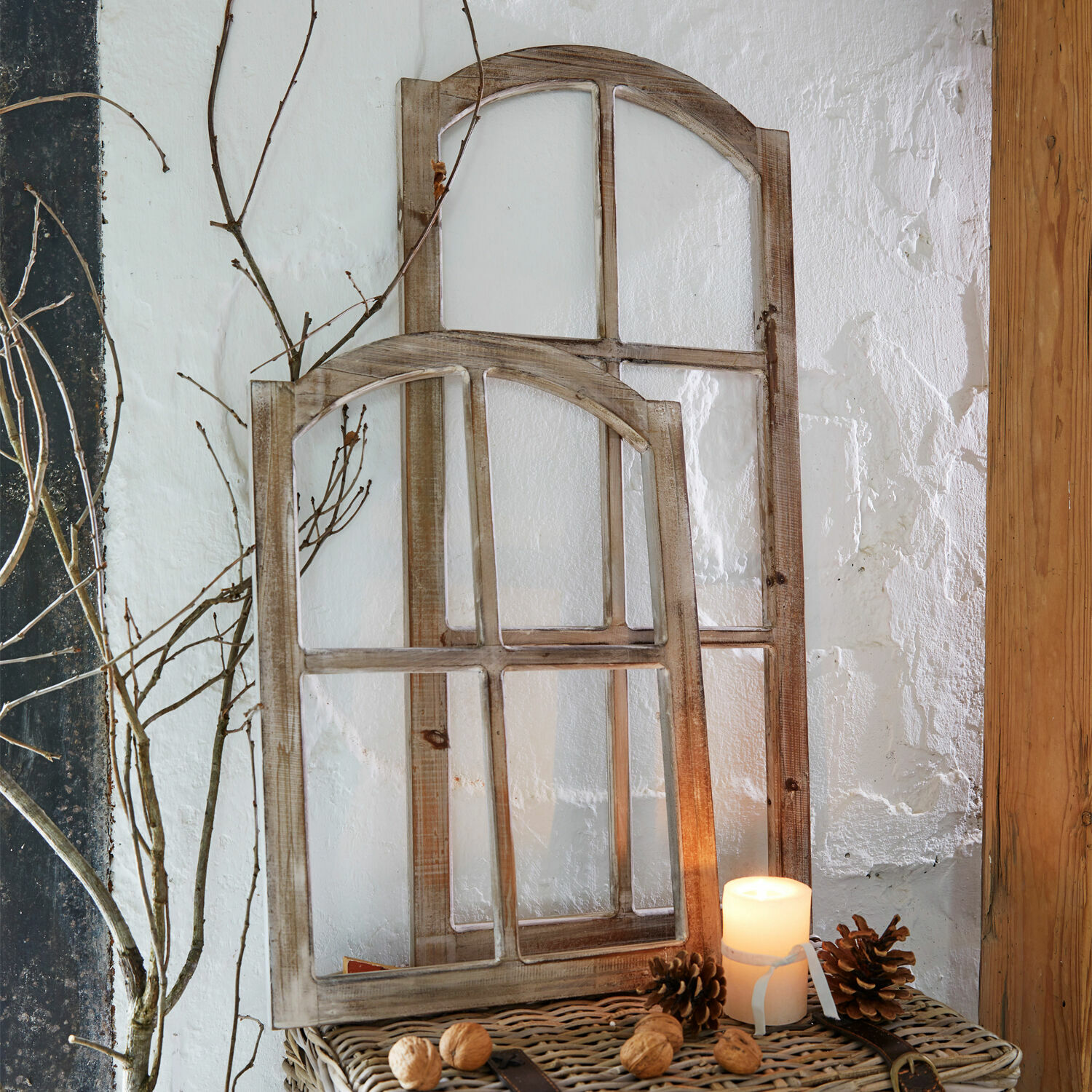 Sie lieben es, mit Ihren Gedanken in die Vergangenheit zu wandern und sich mit Accessoires zu umgeben, die ein bisschen vom Flair früherer Zeiten in unsere Gegenwart tragen? Dann dürfen diese beiden Deko-Fenster auf keinen Fall in Ihren Räumen fehlen! Wirken die beiden nostalgischen Sprossenfenster nicht so, als hätten sie viele Jahre im Damenzimmer eines südfranzösischen Landhauses den Blick in den nahen Park erlaubt? Auf jeden Fall zeugen die deutlichen Gebrauchs- und Abnutzungsspuren im ehemals hellen Lack des Tannenholzes von einem früheren Leben, das uns Accessoires wie diese Fenster so wertvoll macht. Und wie sich früher mit dem Wechsel der Jahreszeiten der Anblick des Parks änderte, so laden auch diese Deko-Fenster Sie ein, mit ihnen jede Jahreszeit anders, aber stimmungsvoll in Szene zu setzen. Im Winter können Sie die Fenster mit glänzenden Kugeln und Lichterschmuck ins Blickfeld rücken. im Frühling verbreiten bunte Blumen beschwingte Stimmung im Raum bis wenig später niedliche Osterhasen den Platz dort einnehmen. Den Sommer über erinnern vielleicht mediterrane Elemente wie Lavendel, Olivenzweige und Co an die Vergangenheit der Deko-Fenster, während dann im Herbst heimische Gehölze und Früchte für eine anheimelnde Atmosphäre im Raum sorgen. In den zwei Größen bilden die Deko-Fenster ein attraktives Paar, Sie können jedes Fenster aber auch solo platzieren.