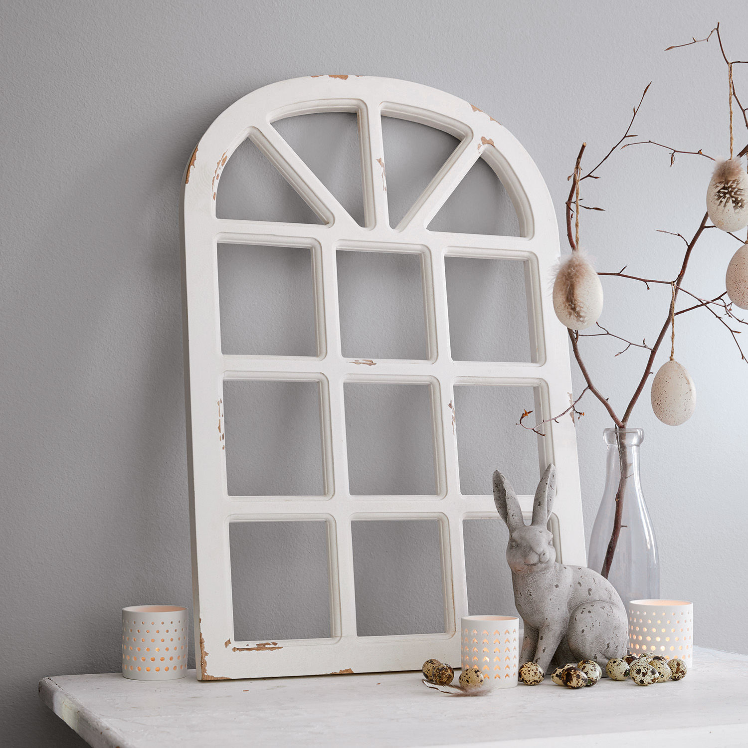 Deko-Fenster haben eine ganz spezielle Wirkung. Obwohl sie ja keinen wirklichen Blick ins Freie gestatten, haben sie dennoch etwas Befreiendes an sich. Es liegt wahrscheinlich daran, dass sie unsere Kreativität beflügeln, indem sie mannigfaltige Dekorationsmöglichkeiten bieten. Beispielsweise könnten Sie es an die Wand des Kinderzimmers hängen und den Kleinen gestatten, das Fenster mit einem blauen Himmel und einer saftigen Wiese zu hinterlegen. Auch auf der Wohnzimmerkommode, lässig angelehnt, setzt das Schmuckstück stilvolle Akzente. Mit einer LED-Girlande umwickelt, wird das Fenster zur charmanten Lichtinstallation. Vor allem die breiten Streben und der Rundbogenabschluss machen das kunstvoll gearbeitete Accessoire zu einem Blickfang. Es wurde übrigens aus natürlich schönem Mangoholz gezimmert und mit einem dezenten Antik-Finish veredelt. Beim Design schwingt eine gehörige Prise Shabby Chic mit und genau deshalb harmoniert es nicht nur mit klassischen, sondern auch mit zeitgenössischen Interieurs.
