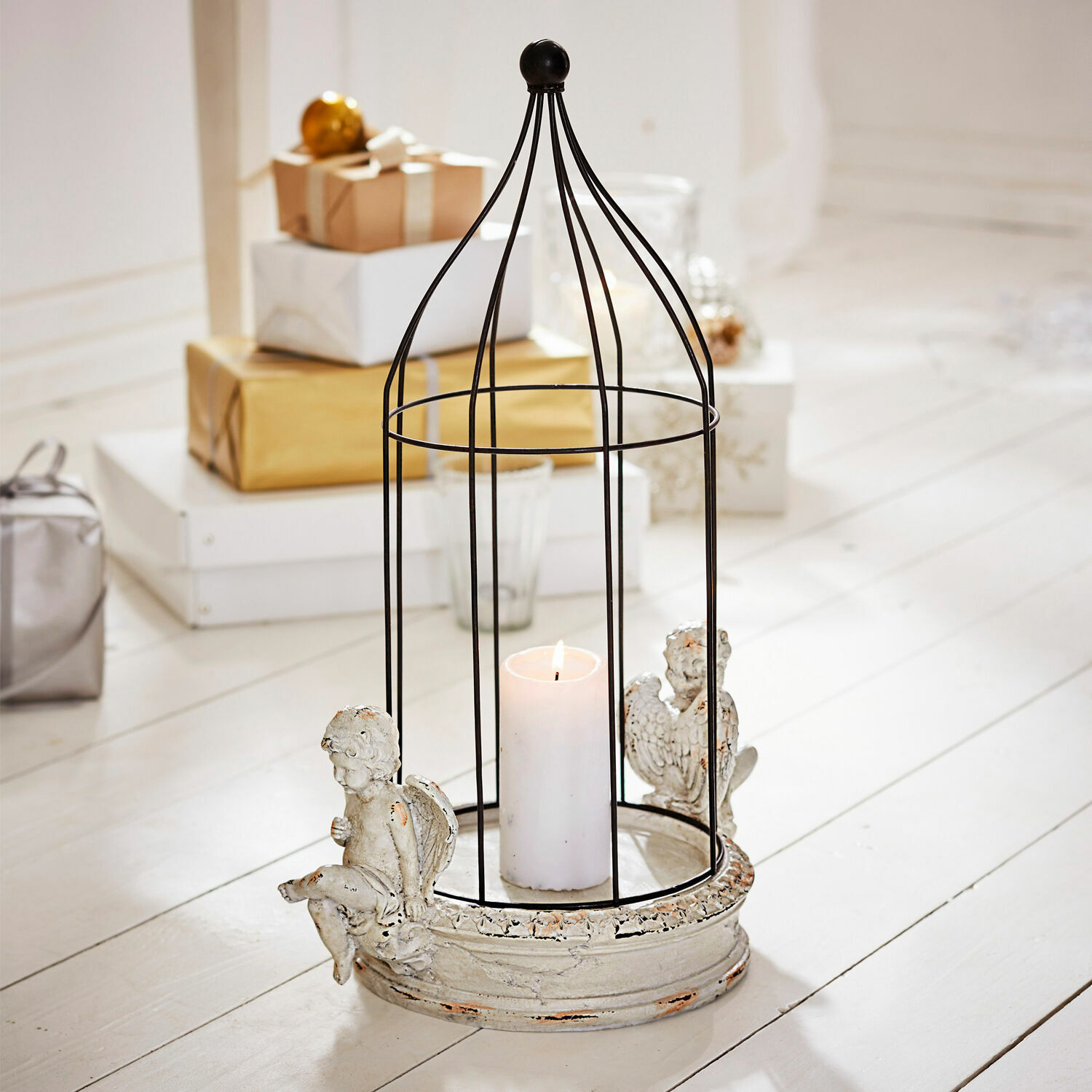 Anmutige Engelchen aus Polyresin zieren den Boden dieses wunderhübschen Accessoires. Ein feines Antik-Finish gibt dem kunstvollen Design eine schöne Patina, und auch die Haube aus Eisen hat nostalgischen Charme. Hier kommt ein sehr romantisches Accesoire im Shabby-Chic zu Ihnen, welches alle Liebhaber der guten, alten Zeit begeistern dürfte. Nicht nur zur Weihnachtszeit zieht mit diesem Schmuckstück ein Hauch Vintage-Romantik bei Ihnen ein. Unter der Haube lässt sich allerlei Schönes kreativ arrangieren, vielleicht Kristalle, Tannenzapfen oder auch Schmuck, der hier aufbewahrt werden könnte. Saisonal lassen sich hier immer wieder neue Effekte erzielen. Doch auch ganz pur versprüht dieses antik anmutende Accessoire seinen besonderen Charme.