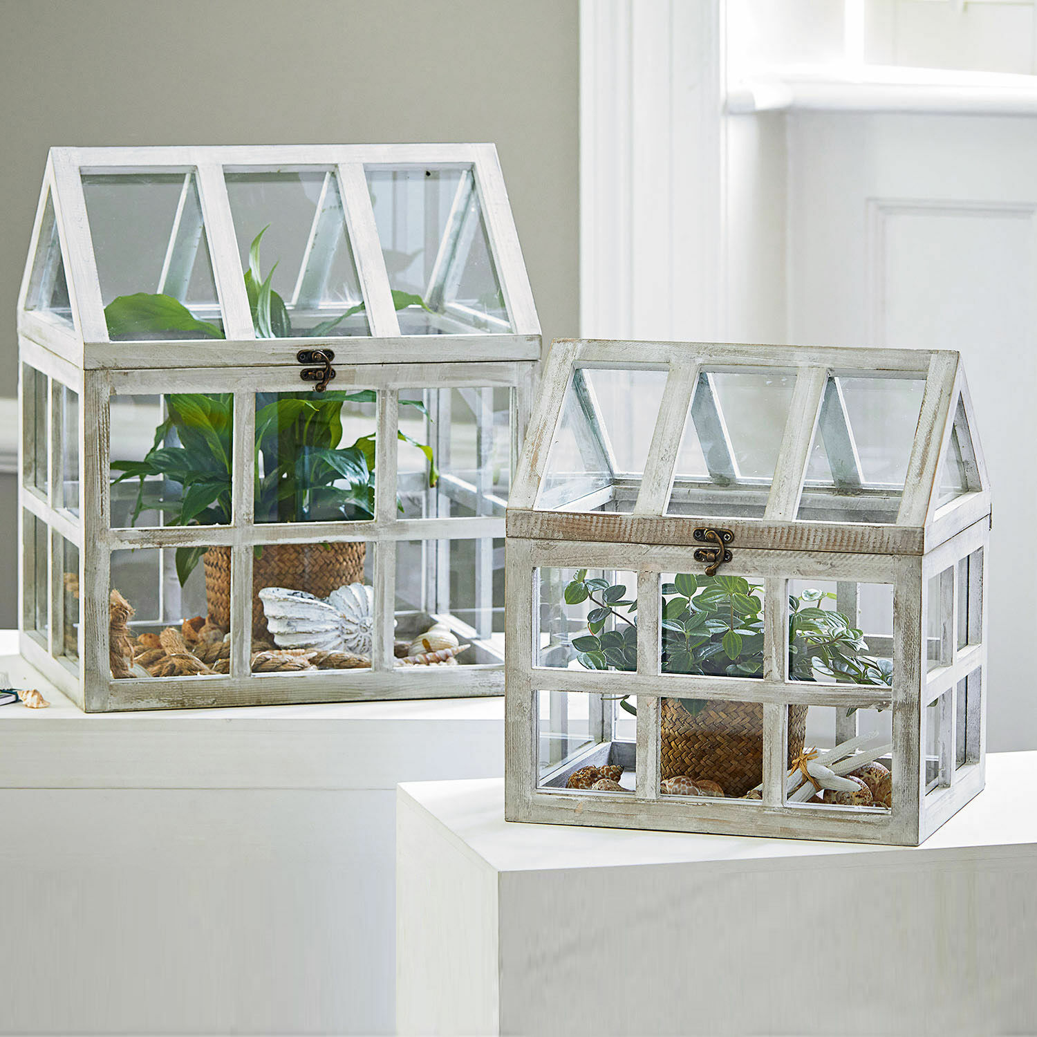 Dieses Set ist das perfekte Zuhause für Ihre kleinen Kakteen, Grünpflanzen oder Setzlinge! Gefertigt aus Tannenholz und Acrylglas macht dieses Set aber auch optisch eine gute Figur. Das Vintage-Design überzeugt durch seine robuste Konstruktion, die sowohl Funktionalität als auch Langlebigkeit bietet und ästhetisch ansprechend ist. Das helle Antik-Finish unterstreicht den besonderen Qualitätsanspruch des Herstellers. Die Dächer sind mit einem hübschen Schließmechanismus aus Zinn versehen, der einen einfachen Zugang zum Inneren ermöglicht. Natürlich können Sie das Set auch für rein dekorative Zwecke verwenden, etwa mit LED-Lichtern, die jedes Häuschen in einen romantischen Lichtspender verwandeln. Oder platzieren Sie Ihre Lieblingsfiguren und Deko-Objekte darin, um ihnen eine besonders charmante Bühne zu bieten!