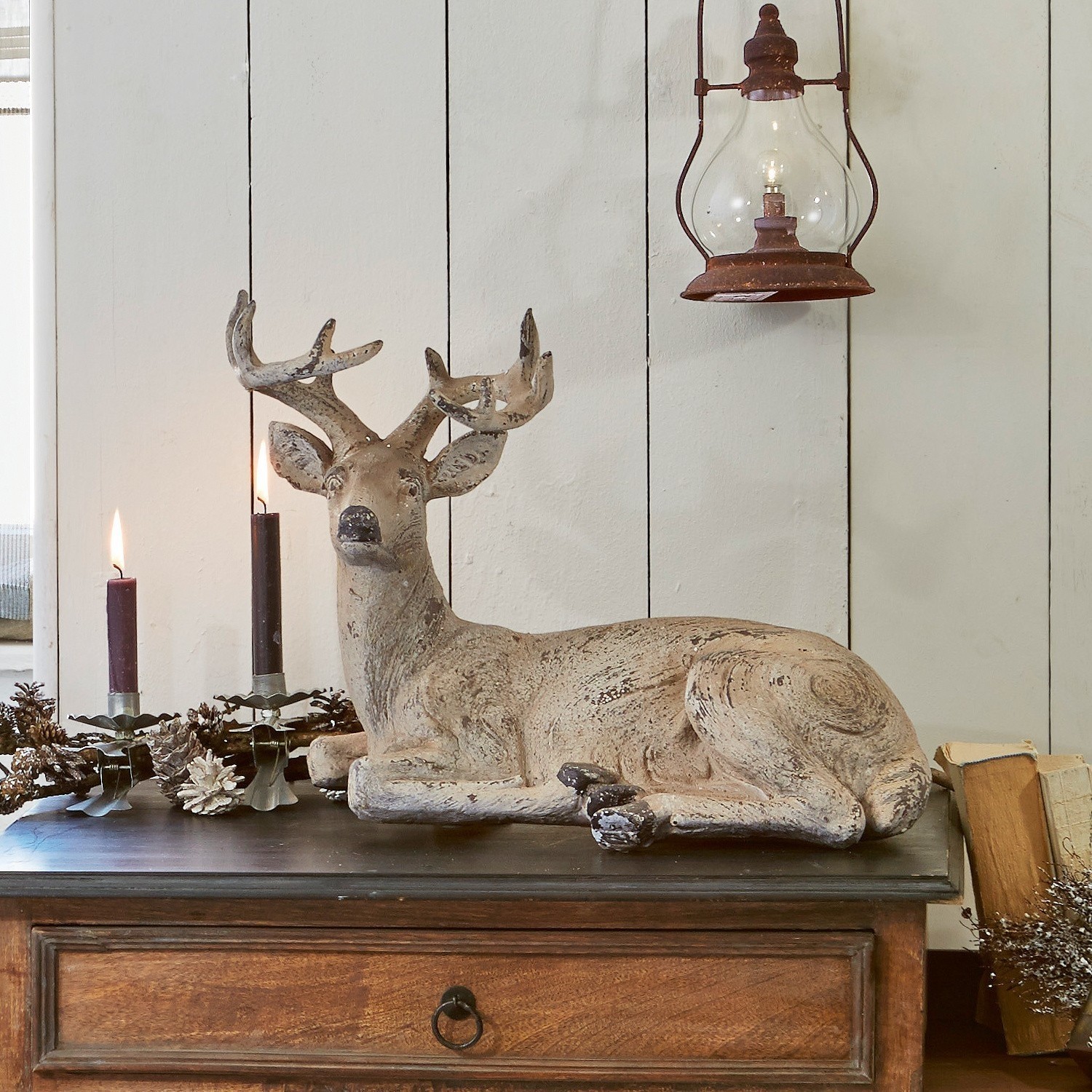 Beinahe wie ein echter Bewohner des Winterwaldes wirkt dieser Deko-Hirsch. Die naturgetreue Tierplastik bringt einen Hauch Natur zu Ihnen nach Hause. Kreieren Sie bezaubernde Winter Wonderland-Arrangements, in die der Deko-Hirsch sich wunderbar einfügen wird. Er besteht aus Polyresin und wurde in liebevoller Handarbeit mit viel Liebe zum Detail hergestellt. Die Augen funkeln, und das prächtige Geweih ist kunstvoll verästelt. Er wirkt beinahe, als wolle er gleich zu einem Streifzug durch den verschneiten Wald aufbrechen. Stilechte Patina und sorgfältig gestaltete Details machen seinen Charme aus. Drapieren Sie ihn zum Beispiel auf der Festtafel, in einem Regal, auf dem Fenstersims oder auf einer Kaminkonsole, vielleicht umringt von einigen Weihnachtskugeln und frischem Tannengrün. Der fast schon lebensechte Hirsch passt sehr gut zu Interiors im Shabby-Chic sowie zu Creme- und Holztönen. Und ein wenig erinnert er zur besinnlichen Weihnachtszeit auch an die Rentiere vor dem Schlitten des Weihnachtsmannes.