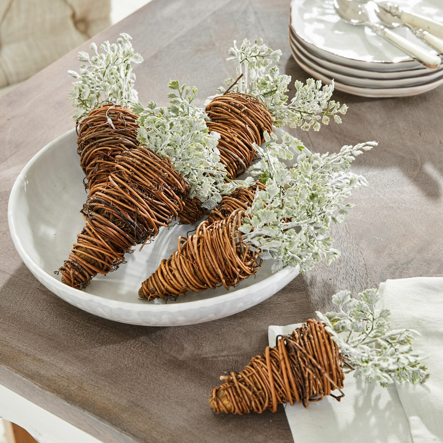Es sind meist die kleinen Dinge, die die Osterzeit noch schöner machen. Dieses 2er Set von hübschen Deko-Karotten ist ein wunderbares Beispiel dafür. In zwei abgestuften Größen sind sie überraschende Hingucker, die überall stimmungsvolle Akzente setzen. Gestaltet in typischer Formgebung zeigt sich jede Karotte außen dekorativ mit natürlichem Rattan umhüllt. Im Inneren findet sich Styropor – darin wird das filigran gefertigte Kunstgrün fixiert und lässt so das Deko-Objekt noch lebendiger wirken. Jetzt müssen Sie nur noch wählen, wo diese originellen Accessoires zur Geltung kommen sollen – vielleicht an der Wand über der Kaminkonsole, auf Ihrer Festtagstafel oder als schmückendes Arrangement in Kombination mit stilvollen Dekoeiern. Lassen Sie Ihren Ideen freien Lauf.