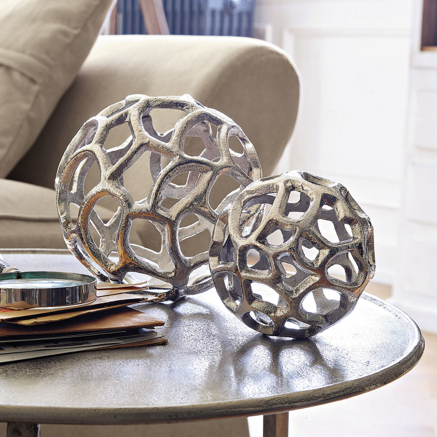 Ein zeitloses Duo mit eleganter Optik. Die beiden kunstvoll geformten Kugeln aus schimmerndem Aluminiumguss sind detailverliebt verziert und bezaubern mit edler Leichtigkeit. Im Set erhalten Sie zwei Größen. Auf einem Tablett, dem Fensterbrett oder dem Tisch arrangiert versprühen sie ihren Charme. Pur oder in Kombination mit hübschen Deko-Objekten wie Kerzen, Federn, Kristallen oder Blumen kreieren Sie hiermit wunderhübsche Akzente. Das stilsichere Design schmeichelt jedem Interior und macht das ganze Jahr über Freude. Wer kreativ werden möchte, könnte auch ein Band an die Kugeln binden und sie an gewünschter Stelle aufhängen.