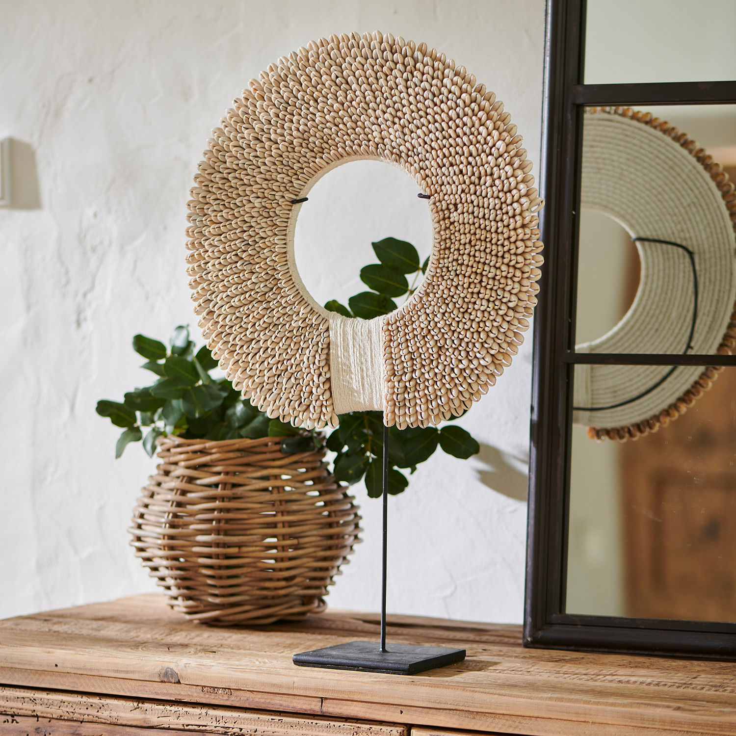 Erleben Sie ein ungewöhnlich schönes und luxuriöses Design – es erscheint beinahe wie ein Fundstück aus dem versunkenen Atlantis. Zahlreiche, echte Muscheln sind in aufwendiger Handarbeit daran verarbeitet. So kommt Unterwasser-Flair in jedes Ambiente. Das recht große Kunstwerk zaubert einen Hauch Südsee für drinnen und draußen in Ihr Heim. Es macht sich gut auf dem Balkon, aber auch in Wohnräumen, wo es jedes Interieur adelt. Der außergewöhnliche Look mit harmonisch runder Form ist perfekt für alle, die das Besondere suchen, und er gibt Ihrem Heim etwas sehr Individuelles. Das passende Gestell besteht aus Eisen. Bei diesem hübschen Anblick können Sie sich jederzeit an weiße Strände träumen.