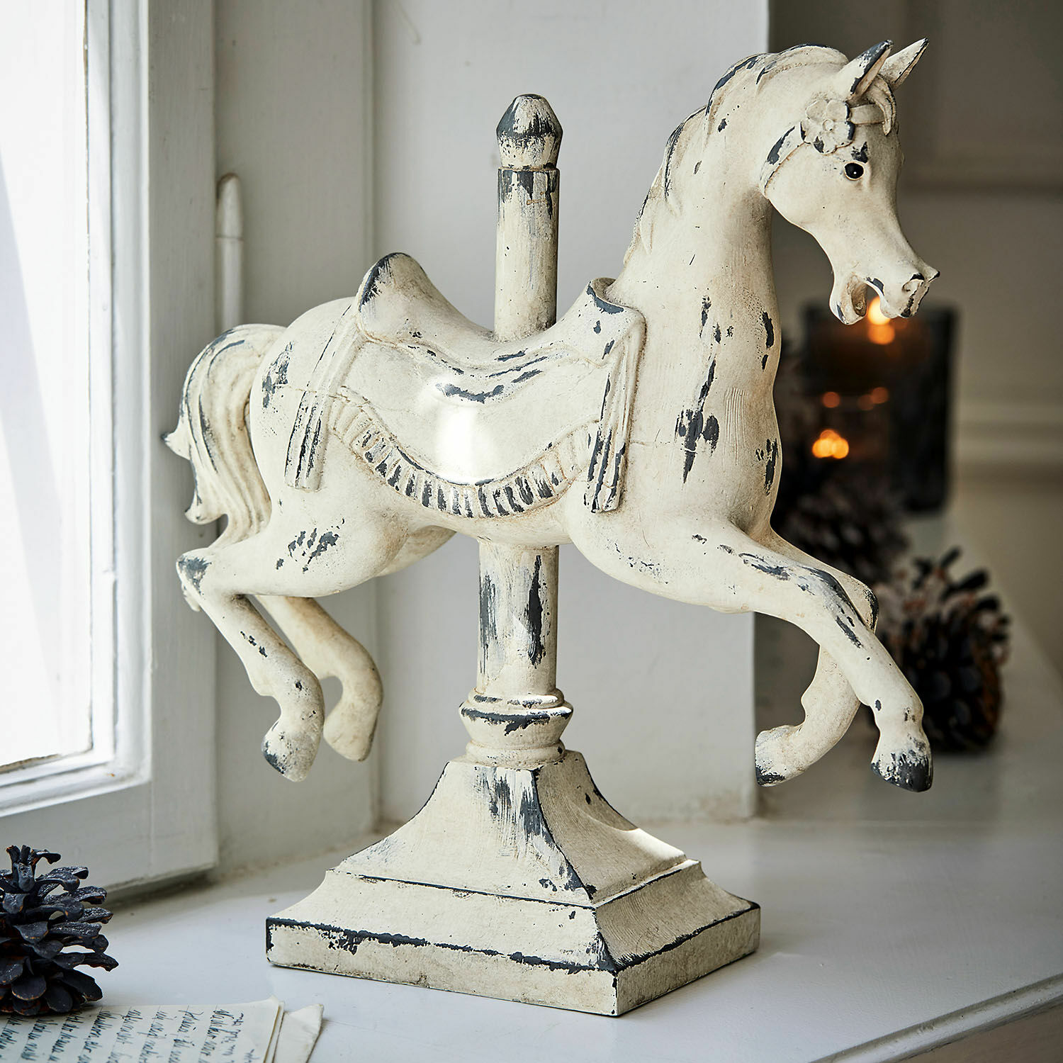 Dieses überaus bezaubernde Karussellpferdchen versprüht Nostalgie pur. Es erscheint direkt einer anderen Zeit entsprungen und passt ideal zum Shabby-Chic. Das detailreiche Design ist aus Polyresin mit Antik-Finish. Es bringt eine Extraportion Vintage-Charme in jeden Raum und sorgt mit seiner verspielten Note für eine angenehme Leichtigkeit. Auf dem Schreibtisch, als Zierde im Regal oder auf einer Kaminkonsole setzt das kunstvolle und detailverliebt designte Pferdchen einen wunderbaren Akzent mit besonderem Flair.