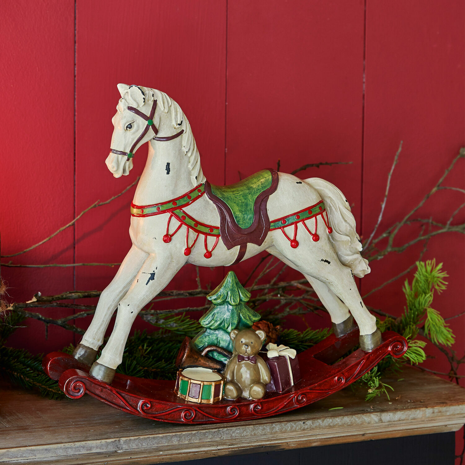 Wer träumt nicht davon, einmal über einen Flohmarkt zu schlendern, ganz plötzlich vor einem Schaukelpferd wie diesem zu stehen und sofort sein Herz daran zu verlieren! Und stammt dieses Deko-Pferd auch nicht aus dem Nachlass einer vornehmen Familie, ist es doch bis ins kleinste Detail wie die historischen Kinderschaukelpferde gestaltet, die fester Bestandteil in vielen Kinderzimmern waren und auf denen Jungen und Mädchen in ihrer Fantasie frei und unbeschwert durch Wiesen und Felder reiten konnten. Von der Mähne des edlen Rosses über das Zaumzeug und den Sattel bis zum reich verzierten Schaukelbalken ist alles da – nur eben en miniature. Es wird jeden Tag aufs Neue eine Freude sein, das Deko-Pferd zu betrachten und seine nostalgische Ausstrahlung im Raum zu erleben. Und wenn Ihr Blick dann unwillkürlich auch zu dem Teddy und dem Tambourin auf dem Schaukelbalken wandert, werden Sie in Gedanken das glückliche Kinderlachen hören, als früher die Kinder zur Bescherung in den Salon geführt wurden und dort das Pferd unter dem Weihnachtsbaum entdeckten. Die Faszination dieses Accessoires liegt auch in der detailreichen und kunstfertigen Ausführung begründet, denn das Deko-Pferd wurde aus dem Kunststein Polyresin gefertigt und sorgfältig von Hand bemalt.