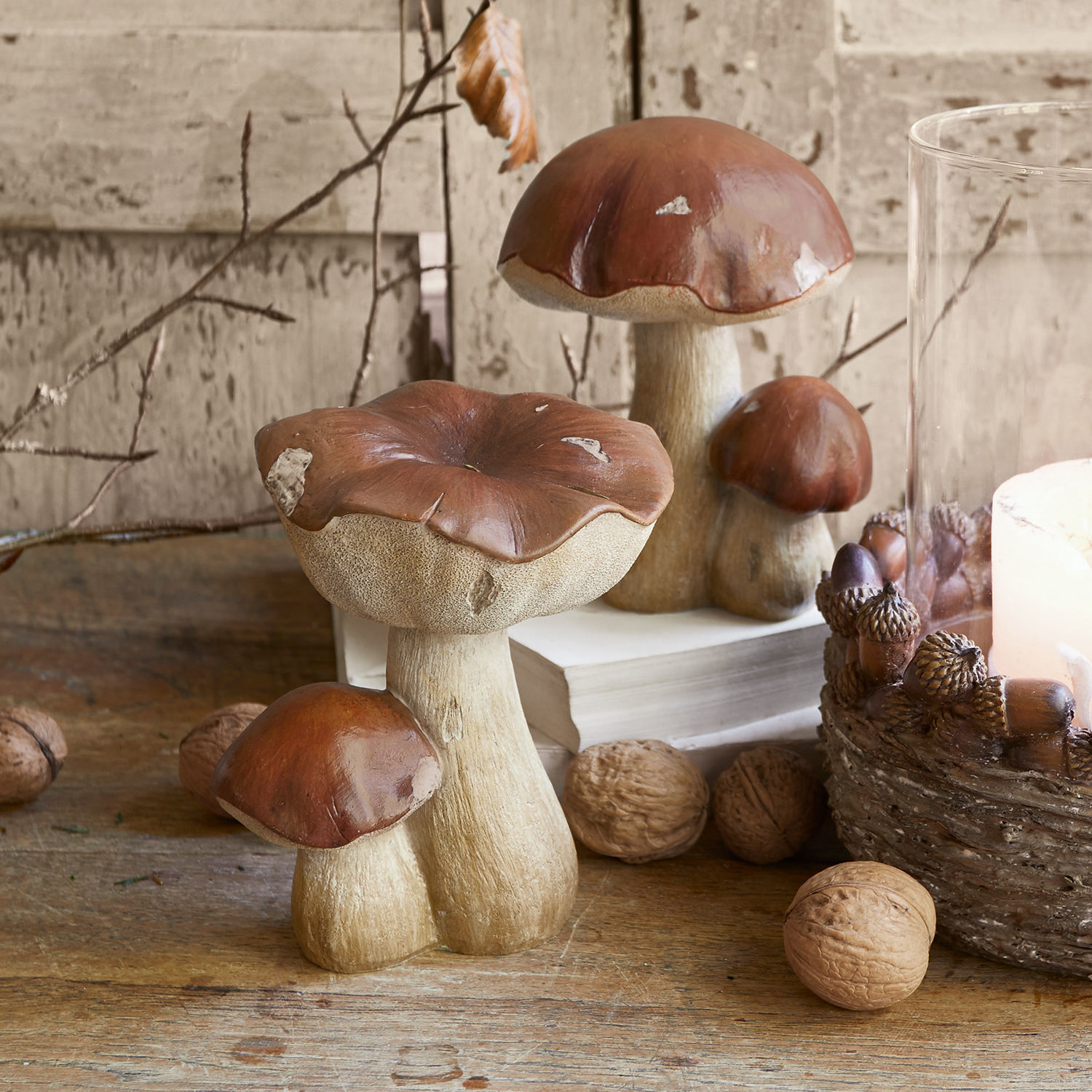 Sobald die Natur sich in ihr buntes Herbst-Gewand hüllt, ist auch die Pilz-Zeit gekommen. Das Flair eines herrlich duftenden Waldes bringt dieses wunderschöne Set in Ihr Zuhause. Die äußerst authentisch nachgebildeten Steinpilze sind aus hochwertigem Kunststein entworfen. Die liebevolle und detailverliebte Bemalung macht die natürliche Optik perfekt. Die unperfekten Stellen auf der Oberfläche sind gewollt. Sie unterstreichen das naturnahe Design zusätzlich. Im Lieferumfang enthalten sind jeweils zwei hübsche Pilz-Paare mit einem größeren und einem kleineren Pilz. Sie sehen einfach überall ganz hinreißend aus. Auf dem Esstisch, auf der Fensterbank oder auf einer Kaminkonsole setzen sie einen herbstlichen Akzent. Besonders schön machen sie sich auch als Teil eines dekorativen Arrangements mit natürlichen Materialien wie Blättern, Nüssen und frischem Moos. Auf einem kleinen Tablett oder einem Teller können Sie so ein Miniatur-Wäldchen entstehen lassen. Für gemütliches Ambiente ist mit diesem Set gesorgt.