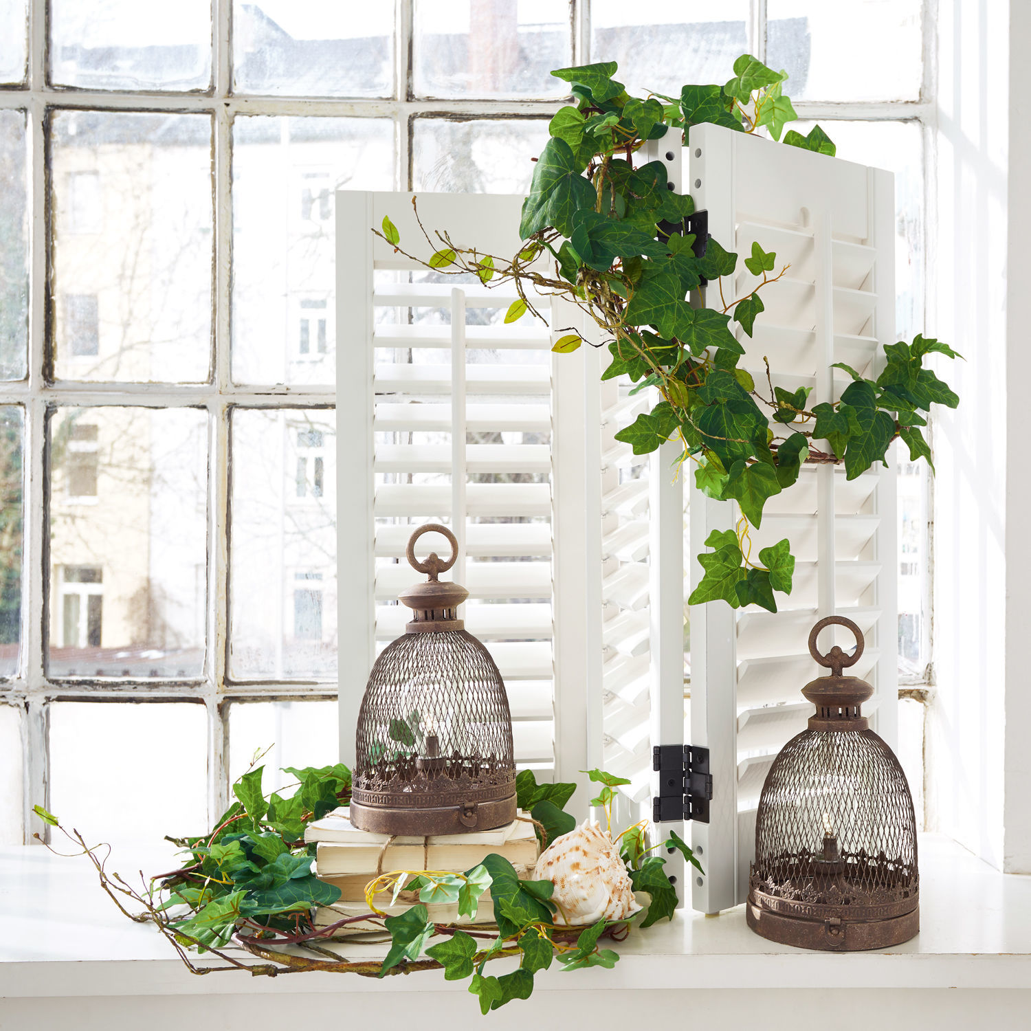 Herzförmige, immergrüne Blätter schmücken elegant geschwungene Triebe, die in der Natur riesige Blätterteppiche bilden oder ganzen Häuserfassaden ein grünes Kleid überstreifen – Efeu ist zweifelsfrei eine Pflanze von hoher Dekorationswirkung. Auch indoor, wenn sie ihre dicht mit Blättern besetzten Triebe aus Ampeln und Töpfen hängen lässt und immergrüne Farbtupfer im Wohnambiente verteilt. Die Deko-Ranke, die wir Ihnen gleich im 2er Set anbieten, vereint all diese wertvollen Eigenschaften in sich, setzt aber noch eins drauf, und das ist ewige Lebensdauer. Die Efeuranken sind aber so kunstvoll von Hand gefertigt, dass niemand den Unterschied zu echten Efeuranken erkennen wird, Sie aber jahrelang den Anblick des frischen Grüns genießen können, das nie verwelken wird. Und wenn schon echter Efeu das Symbol für Treue und Unsterblichkeit ist, um wieviel mehr gilt das dann für diese täuschend echten Efeuranken. Lassen Sie sich von der Deko-Ranke im 2er Set zu den unterschiedlichsten Arrangements inspirieren – Sie werden selbst begeistert sein, wie vielseitig die Efeuranken einsetzbar sind. Sie können zum lockeren Türkranz geflochten werden, sie lassen sich von Regalen oder Gardinenstangen hängen, sie winden sich um Windlichtgläser und tun so, als würden sie aus alten Tonkrügen wachsen. Vielleicht sollten Sie doch gleich noch ein paar Triebe mehr nehmen? Die Deko-Ranke im 2er Set besteht aus Kunststoff, der Eisendraht sorgt für die gute Biegsamkeit.