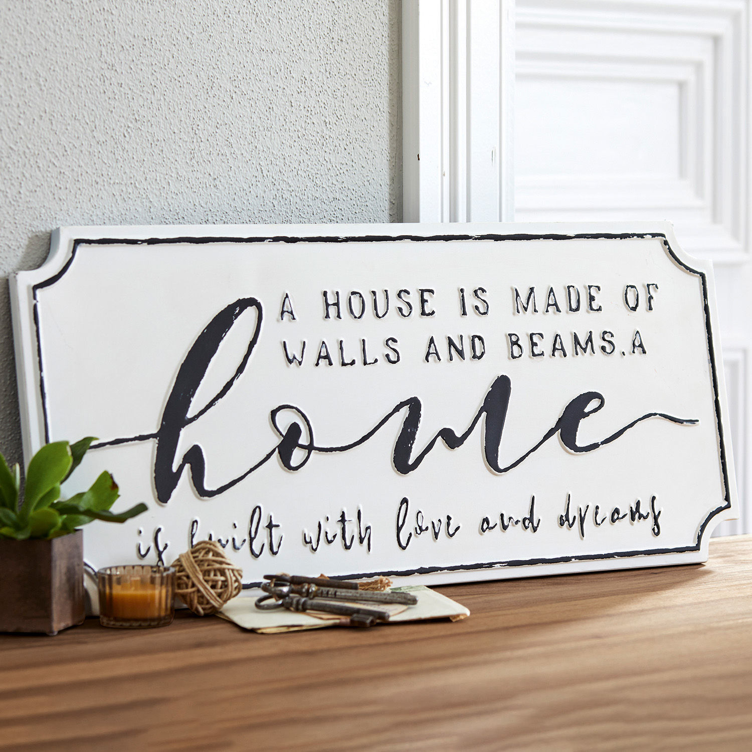 Ein klassisches Design mit nostalgischer Note, mit dem Sie wunderbar Ihr Zuhause feiern können. Das hübsche Schild aus Eisen ziert ein Druck mit unterschiedlichen Lettern. Das englische Motto lautet, ein Haus besteht aus Wänden und Balken, ein Zuhause wird aus Liebe und Träumen gebaut. Ein schöner Gedanke, oder? Das charmante Schmuckstückchen lässt sich dank eines Hakens auf der Rückseite ganz leicht hängen oder angelehnt aufstellen, vielleicht auf einer Kommode oder im Regal. Es passt bestens zum Landhaus-Stil und findet vielleicht im Flur oder im Wohnzimmer ein hübsches Plätzchen. Oder Sie überraschen damit jemanden, der gerade ein neues Zuhause gefunden hat – eine nette Geste. So oder so wird dieses reizende Vintage-Design für Freude sorgen.