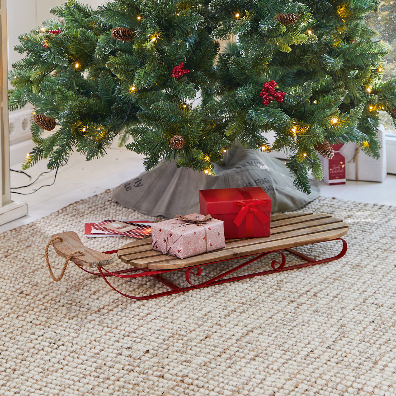 Manchen Deko-Objekten gelingt es besonders gut, unsere Gedanken aus der Gegenwart in die Vergangenheit zu lenken. Als die Winter noch kalt und die Landschaften tief verschneit waren und die Kinder keinen schöneren Zeitvertreib kannten, als mit einem alten Schlitten die Hügel in der näheren Umgebung hinunter zu rodeln. Immer und immer wieder. Über Komfort oder stylisches Design machte sich damals niemand Gedanken, wichtig war nur, dass sie schnell waren und auch mal einen Sturz in den Schnee aushielten. Anforderungen, denen dieser Dekoschlitten ohne weiteres gewachsen war. der mit seinem stabilen Kufengestell in Rot und der Sitzfläche in naturbelassenem Tannenholz aber auch optisch einiges mehr hermachte als andere. Ob damals der Großvater oder sogar der Urgroßvater als Kind auf diesem Schlitten seinen Mut und seine Geschicklichkeit beim Lenken unter Beweis stellte? Auf jeden Fall genießen wir heute dankbar das nostalgische Feeling, das der Dekoschlitten in unseren Räumen zur Winterzeit verbreitet. Mit wenigen Handgriffen können Sie ihn zum stimmungsvollen Highlight im festlich dekorierten Wohnraum machen, der Dekoschlitten kann aber auch schon im Eingangsbereich Sie und Ihre Gäste auf die Weihnachtszeit einstimmen. Mit einigen grünen Zweigen, Zapfen und einer Lichterkette oder üppig bepackt mit vielen Deko-Päckchen, als hätte der Weihnachtsmann seinen Schlitten bei Ihnen vergessen.