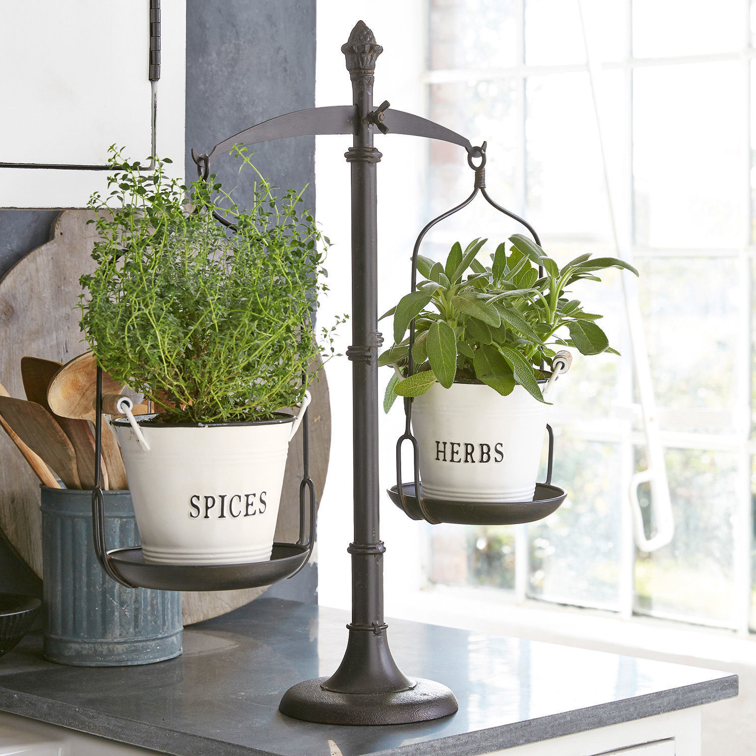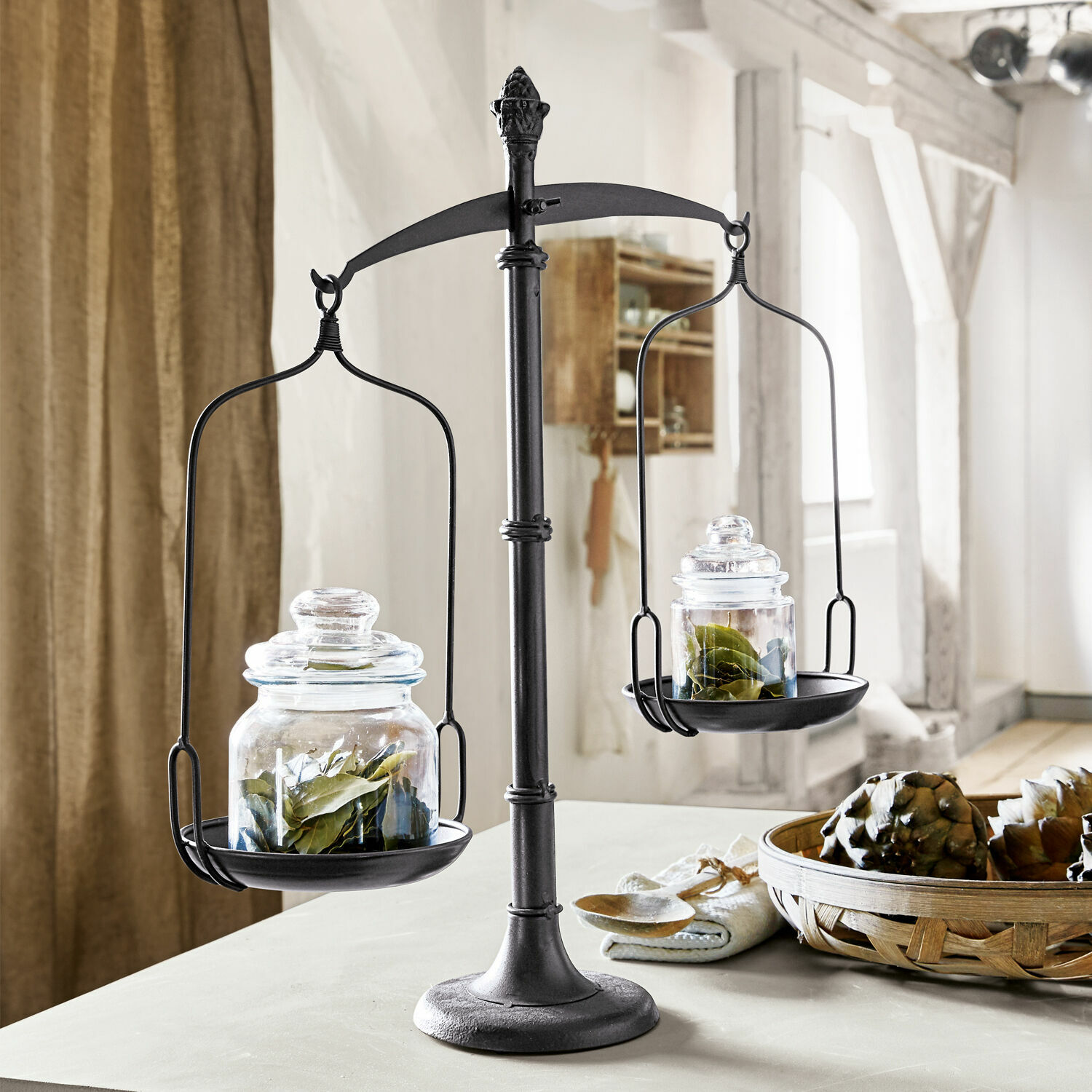 Diese Deko-Waage gehört einfach zum Repertoire jedes Nostalgie-Liebhabers. War sie doch in vergangenen Zeiten ein nützlicher Küchenhelfer, die beim Zubereiten von Speisen und Backwaren ihre treuen Dienste leistete. Heute hat sie ihr praktisches Image abgelegt und dient ausschließlich dekorativen Zwecken. Gefertigt aus robustem, antik veredeltem Eisen zeigt sie sich in filigraner Schönheit, was die kunstvolle Verarbeitung wunderbar zum Ausdruck bringt. Hierzu gehören die zwei runden Schalen, die an einem waagerechten Balken hängen. Das Ganze wird von einem formschönen Fußständer gehalten. Das abschließende Ornament verleiht dem Deko-Objekt das schmückende i-Tüpfelchen. Schon als Solist bringt das Accessoire viel Stil und Flair in Ihr Küchenambiente. Auch dekoriert mit frischem Grün, wie beispielsweise kleinen Kräutertöpfen oder bunten Frühlingsblühern wird sie zu einem wirkungsvollen Hingucker. Mit dem behaglichen Landhaus-Stil oder Shabby-Chic harmoniert die Waage perfekt, einen spannenden Akzent setzt sie in modernem Interieur. Die gezeigten Blumentöpfe sind natürlich nicht im Lieferumfang enthalten. So können Sie aber selbst kreativ werden und die Waage mit allerhand anderer Deko bestücken.