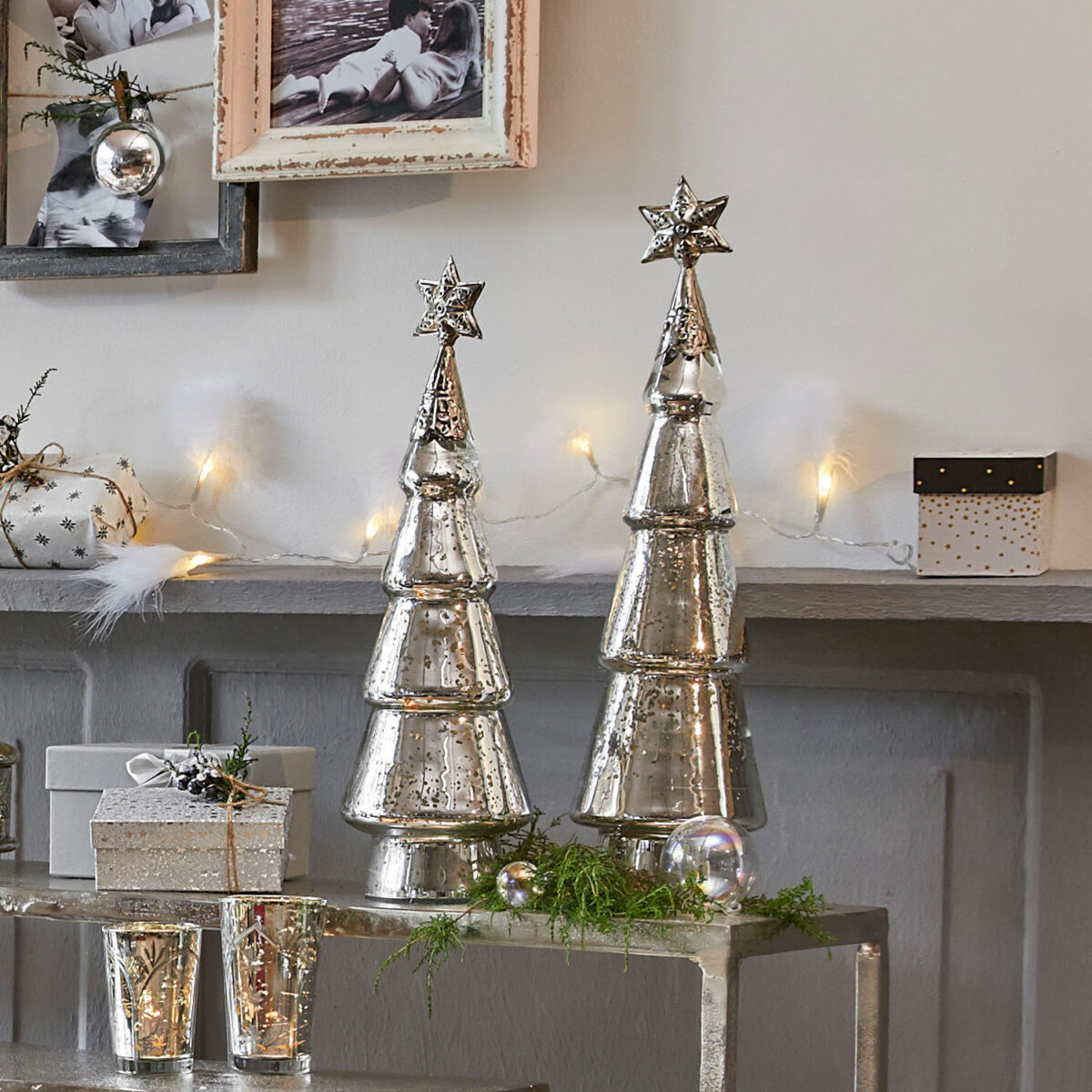 Die stattlichen Dekobäume erhellen mit ihrem edlen Silberglanz auch Ihre vier Wände zur Weihnachtszeit: Aus schwerem Glas gefertigt und in liebevoller Handarbeit auf der Innenseite mit einem Antik-Finish versehen, kommen die Tannenbäume in zwei Größen zu Ihnen nach Hause. Die Kronen verziert mit einem ziselierten Metallstern. Die schlichte Eleganz dieser Weihnachtsdekoration und das angesagte Vintage-Finish passt zu jedem Stil und lässt sich ganz wunderbar in allerlei kreative Dekorationsideen zum Fest integrieren.