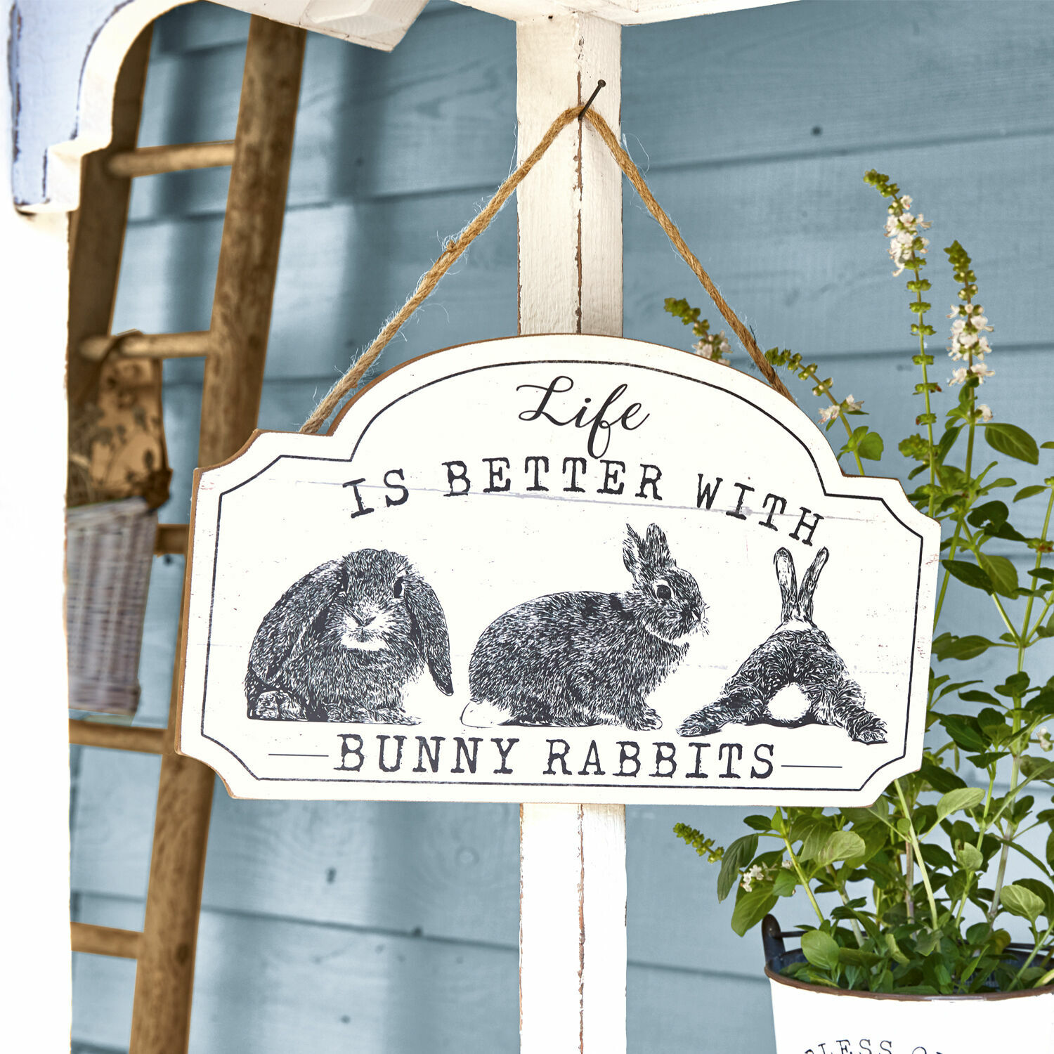 Life ist better with bunny rabbits – dieses Dekoboard ist mit seinem aufgedruckten Schriftzug eine wahre Liebeserklärung an die putzigen Vierbeiner – und die liebevoll gestalteten Positionen der Kaninchen zaubern jedem Betrachter ein Lächeln ins Gesicht. Origineller können Sie das kommende Osterfest nicht ankündigen. Und weil das Ganze im Vintage-Look noch schöner wirkt, wurde eine stabile Holzfaserplatte in authentischer Holzlatten-Optik verarbeitet. Ein Aufhängeband aus natürlicher Jute rundet das Dekoschild stilvoll ab. Ein stimmungsvolles Dekostück, das nahezu überall einen reizvollen Akzent setzt – ob drinnen in der Küche oder draußen auf der Terrasse oder an Ihrem Gartenhaus.