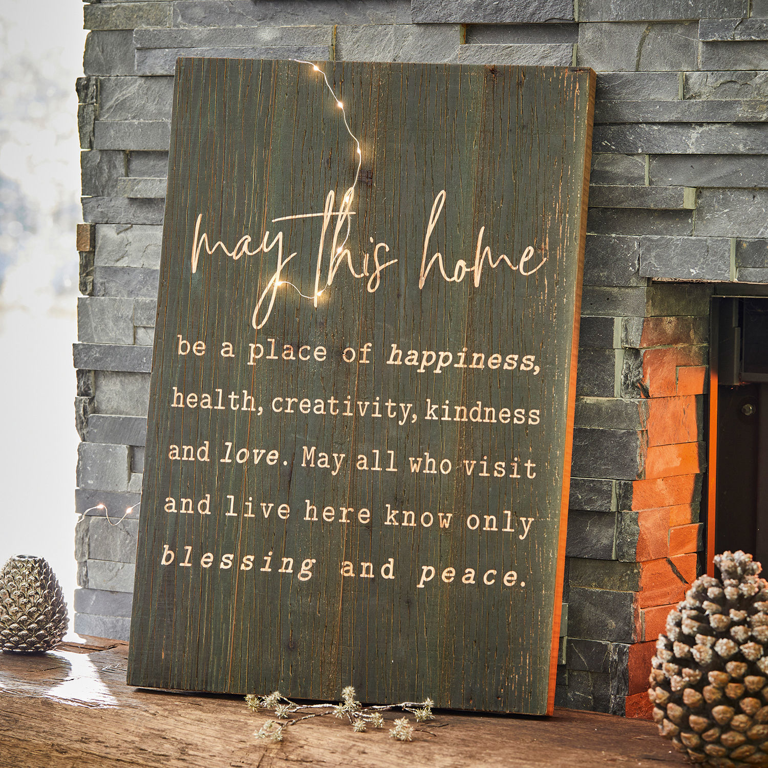 Wenn ein Raum wunderschöne Möbel beherbergt und dennoch ungemütlich wirkt, ist das sehr oft den kahlen Wänden geschuldet. Gemusterte Tapeten oder Wandtattoos können Abhilfe schaffen, doch am einfachsten schmücken sie eine leere Wand mit einem hübschen Deko-Board. Dieses Modell ist nicht nur hübsch anzusehen, sondern es vermittelt auch eine positive Botschaft: Möge dieses Heim ein Ort des Glücks, der Gesundheit, Kreativität, Güte und Liebe sein. Mögen alle, die es besuchen oder hier leben, ausschließlich Segnung und Frieden erfahren. Mit diesem Wandkunstwerk beleben Sie wirklich jeden Raum, ganz gleich, ob Schlafzimmer, Flur, Bad oder Küche. Die herzliche Message kommt auf dem natürlich schönen Tannenholz besonders gut zur Geltung. Die Attraktivität der feinen Maserung wird durch den charmanten Farbton noch intensiviert.