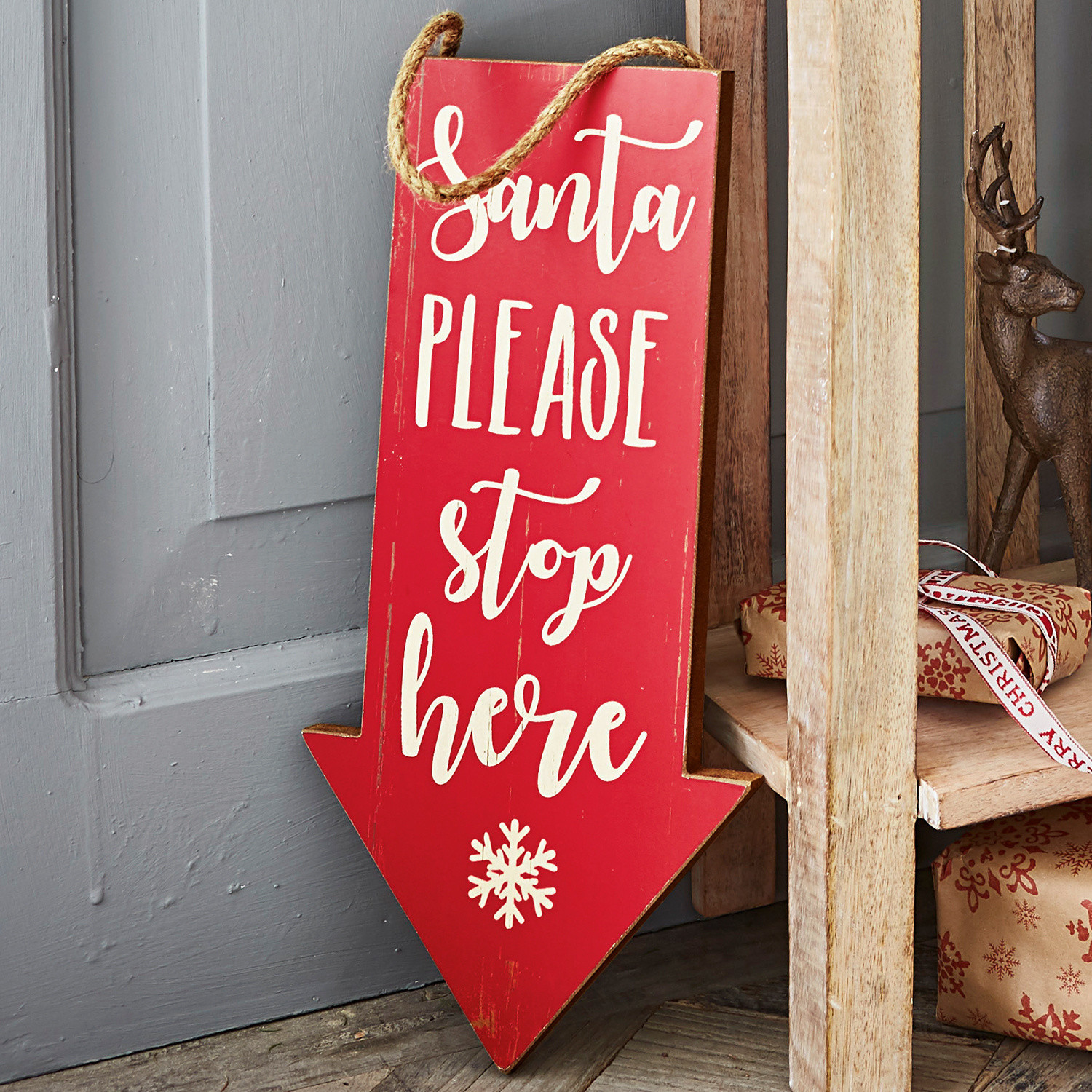 Dieses wunderhübsche, hölzerne Deko-Board macht wirklich jedem Lust auf das Fest. Es ist von Hand bedruckt und gefertigt. Bitte einmal hier anhalten, Santa Claus! Dieser charmante Gruß zaubert uns in der Winterzeit ein Lächeln ins Gesicht. An einem Band aus Flachs lässt es sich flexibel aufhängen – vielleicht am Türgriff, im Fenster oder an einem Balken. So werden die Weihnachtstage gleich noch ein Stückchen stimmungsvoller.