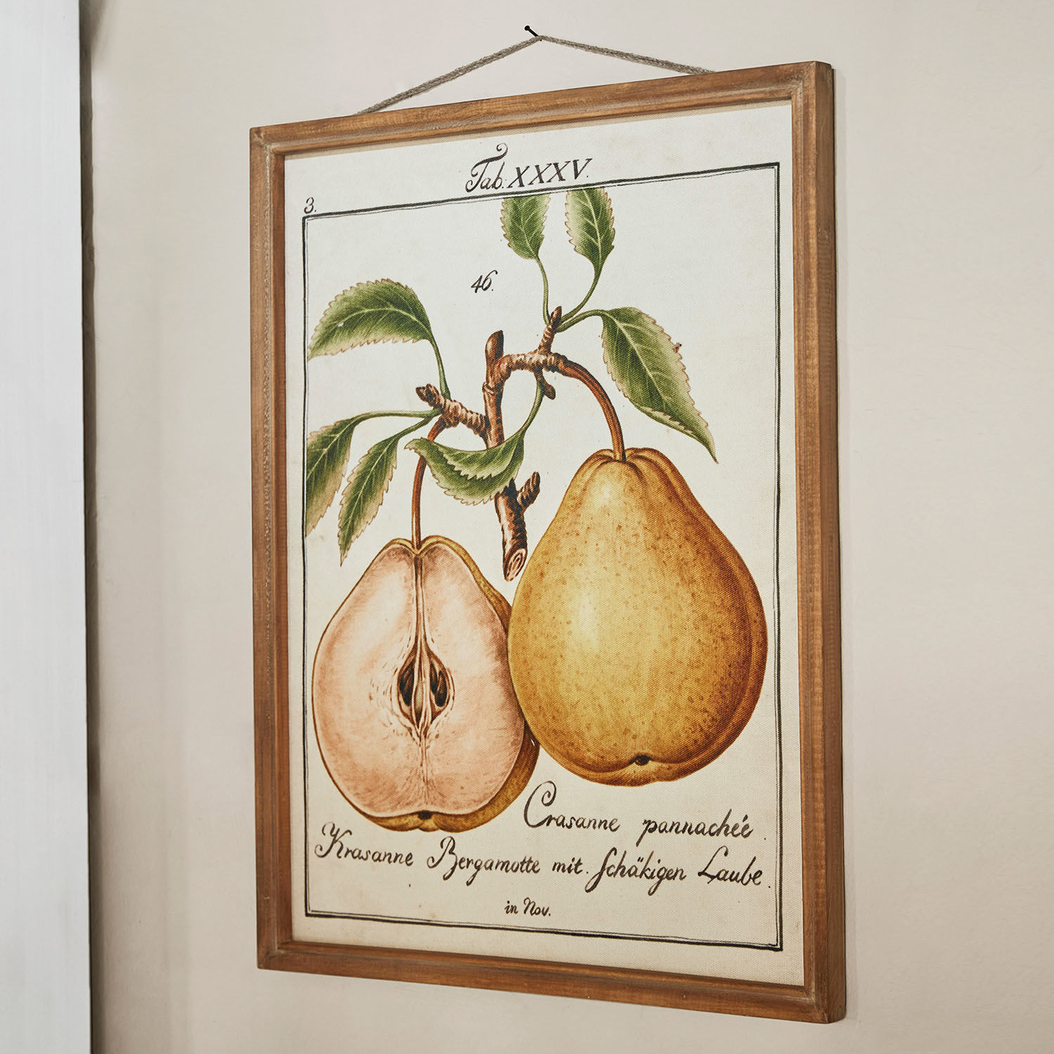 Holen Sie sich eine stilvolle Prise Nostalgie in Ihr Heim. Dieses wunderschöne Deko-Board bezaubert mit einem kunstvollen Druck, der an alte Botanik-Bücher erinnert. Nicht nur zum Shabby-Chic entsteht hiermit ein harmonisches Ambiente. Der klassische Print auf Stoff ist über eine Basis aus MDF gezogen, sodass das Board schön stabil ist. Der Rahmen besteht aus natürlichem Kiefernholz, die Aufhängung aus Eisen. So lässt sich das schicke Accessoire ganz einfach an der Wand aufhängen. Sie können es aber auch angelehnt aufstellen. Eine wahre Zierde für die Küche, welche hiermit Country-Flair erhält, und natürlich auch in Wohnräumen ein Highlight. Das detailreiche und zeitlose Birnen-Motiv bleibt sicherlich über viele Jahre ein attraktiver Anblick.