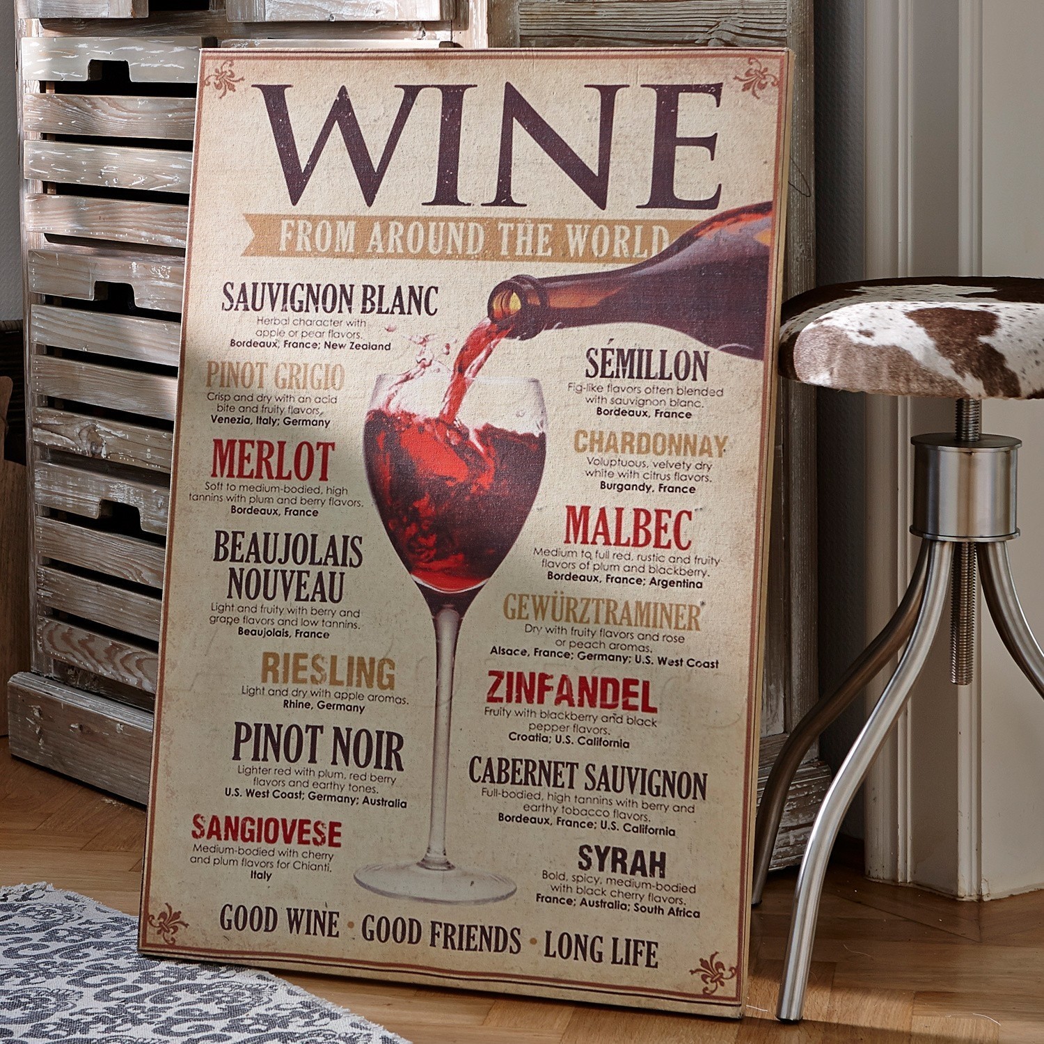 Wer bei der nächsten Weinprobe mit Fachwissen glänzen will, trainiert am besten die Geschmacksknospen und lernt ein paar Rebsorten auswendig. Besonders stilvoll geht das jetzt mir diesem vielsagenden Dekoboard. Von Merlot bis Malbec werden hier die wichtigsten Rebsorten aus aller Welt aufgeführt – zusammen mit den jeweils hervorstechendsten Eigenschaften. Das Board wurde von den Plakaten in Vinotheken inspiriert und macht sich ganz wunderbar im Wohn- oder Esszimmer sowie in der Küche. Das Design im angesagten Vintage-Look passt großartig zu jedem Einrichtungsstil, egal ob Fabrik-Look oder Landhaus-Style. Am besten befestigen Sie das Dekoboard dort auf, wo Sie am liebsten Ihren Wein genießen. Beim Vorbeigehen und Betrachten können Sie sich so nach und nach die Merkmale der verschiedenen Trauben merken und demnächst als Weinkenner glänzen.