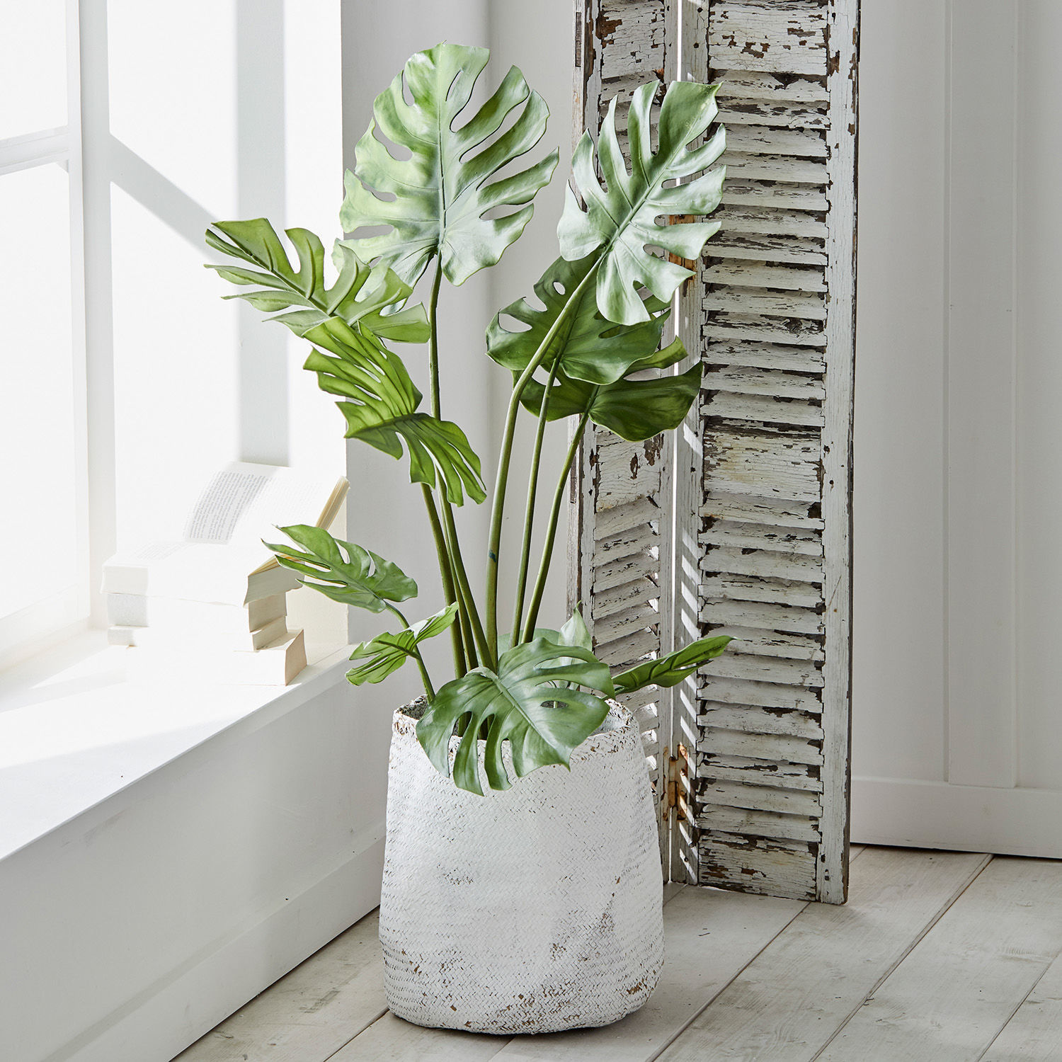Sie träumen von einem wohnlichen Zuhause, in dem auch dekorative Zimmerpflanzen für den natürlichen, frisch-grünen Touch sorgen? Sie sind aber viel unterwegs und aufwendige Pflanzenpflege in der kostbaren Freizeit ist nicht gerade Ihre Leidenschaft? Dann haben wir hier die Lösung für Sie: Eine prachtvolle Monstera, die so pflegeleicht ist, dass Sie sie nur alle paar Monate einmal ein bisschen abstauben müssen. Das reicht völlig! Denn bei dieser ursprünglich aus Mittel- und Südamerika stammenden Monstera hatte nicht die Natur ihre Hand im Spiel, sondern auf Kunstpflanzen spezialisierte Floristen, die allen Ehrgeiz daransetzen, ihre Pflanzenkunstwerke so naturgetreu wie möglich nachzubilden. Und das ist bei dieser Kunstpflanze perfekt gelungen. Von den imposanten, herzförmigen Blättern bis zu den typischen Blattadern und den natürlichen Grün-Variationen wird niemand den Unterschied zu einer echten Monstera entdecken. Vor allem, wenn Sie der Kunstpflanze auch noch einen schönen Übertopf gönnen. Neben der absoluten Pflegeleichtigkeit bietet Ihnen diese Kunstpflanze außerdem den Vorteil, dass sie ihre beeindruckende Raumwirkung auch gerne in einer dunkleren Zimmerecke entfaltet – ein Standort, den echte Pflanzen selten goutieren. Sie wird keine Blätter verlieren, bekommt keine Krankheiten und außerdem lassen sich die Blattstängel dank des eingearbeiteten Drahts leicht in Form biegen, so dass Sie die Kunst-Monstera an ihrem neuen Platz optimal arrangieren können.