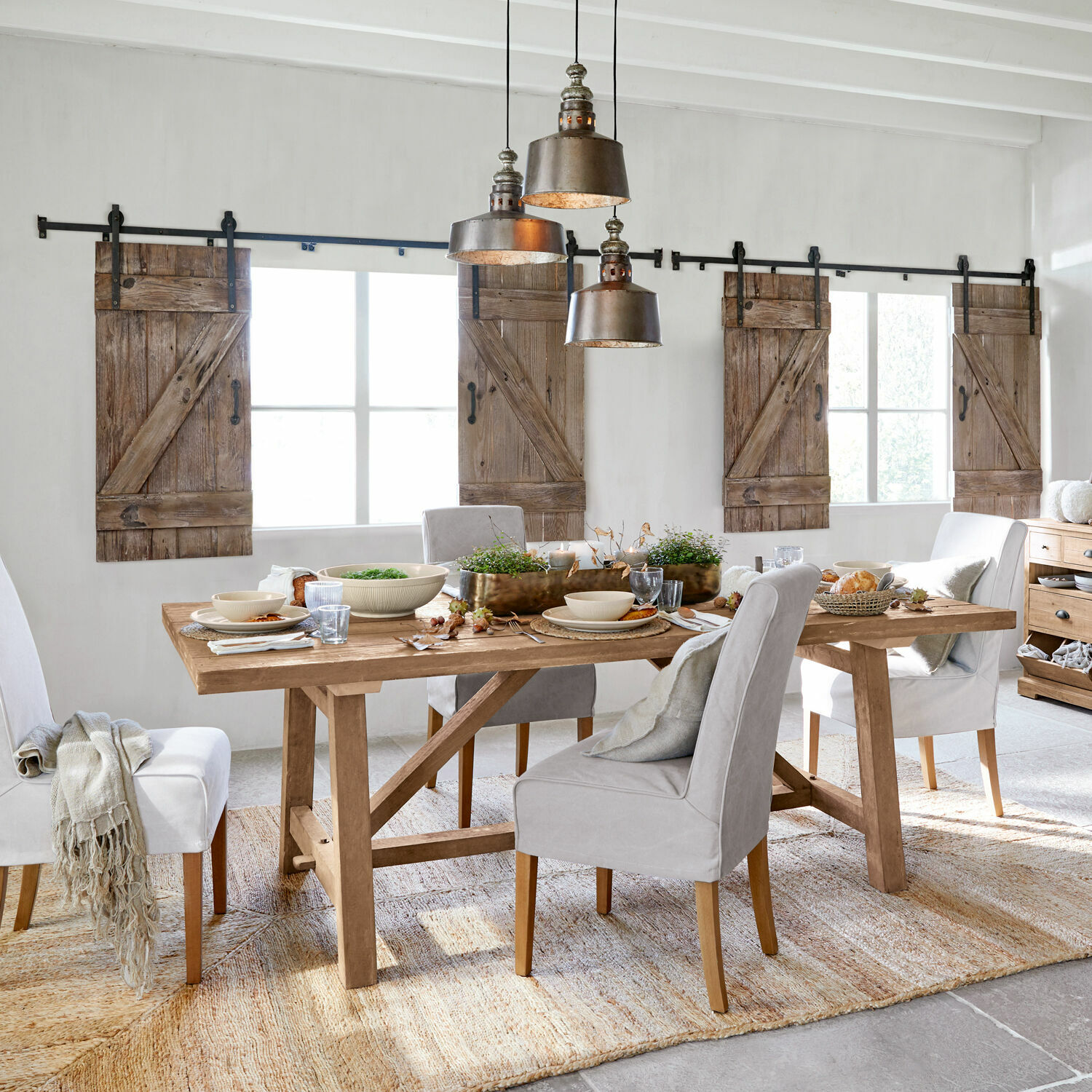 Eine schöne Alternative für Fensterläden: Mit dieser Schiebetür können Sie platzsparend Fenster ohne ausladende Flügeltüren verschließen. Oder vielleicht auch Schränke verschließen oder Wände dekorativ gestalten. Die Schiebeelemente gleiten geschmeidig an ihrer robusten Eisenschiene entlang und sind je nach Ihrer Einrichtung perfekt für Ihren Wohn- oder Hobbyraum, aber auch für Ihr Schlafzimmer oder Ihre Küche. So können Sie Ihr Zuhause mit dem gewissen Etwas aufwerten. Das wiederaufbereitete Kiefernholz, das die Türen auszeichnet, ist ein Statement in puncto Nachhaltigkeit. Und für eine komfortable Handhabung sind an den Seiten, die zum Innenraum zeigen, Griffe angebracht. Eine Handbewegung und Sie verdunkeln oder erhellen den Raum im Nu, indem Sie die Schiebetüren vor dem Fenster bewegen und nach Ihren Lichtwünschen platzieren. Für den besonderen ästhetischen Akzent sorgen der historische Charme und die natürlichen Holzmaserungen der schicken Schiebetüren. Diese Maserungen werden durch ein schönes White-Washed-Finish zusätzlich intensivert und geben den Türen einen ganz besonderen Look.
