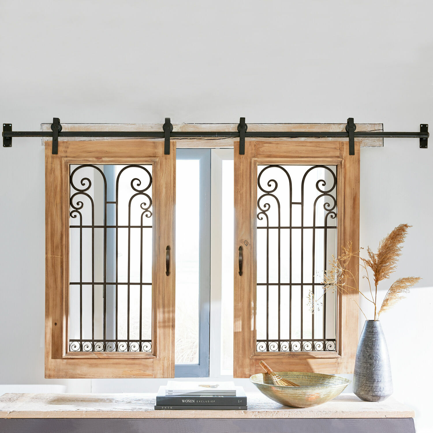 Diese hübsche Doppelflügel-Schiebetür aus natürlichem, unbehandeltem Kiefernholz gibt Ihrem Wohnambiente einen wundervollen historischen Look. Sie verbindet robustes Eisen mit dem angenehmen Naturmaterial. Durch ihre Antik-Optik fügt sie sich perfekt in Wohnräume im Retro- oder Landhausstil ein. Besonders reizvoll: die geschwungenen Eisenstreben des Fensters, die der Erscheinung dieses Schmuckstücks einen ganz besonderen visuellen Reiz verleihen. Mit dabei ist eine Schiebevorrichtung, ebenfalls aus robustem Eisen, sodass nicht nur eine komfortable Funktion gesichert ist, sondern auch Langlebigkeit über Jahrzehnte hinweg. Ein Griff befindet sich dabei auf der Vorderseite, um die Türen einfach aufschieben zu können. Wenn Sie mehr wollen als nur einen Vorhang fürs Fenster, wird Sie diese Doppeltür begeistern. Denn aufgrund ihrer außergewöhnlichen Optik ist dieses wundervoll gestaltete Schmuckstück zweifellos eine Bereicherung für Ihr Zuhause.