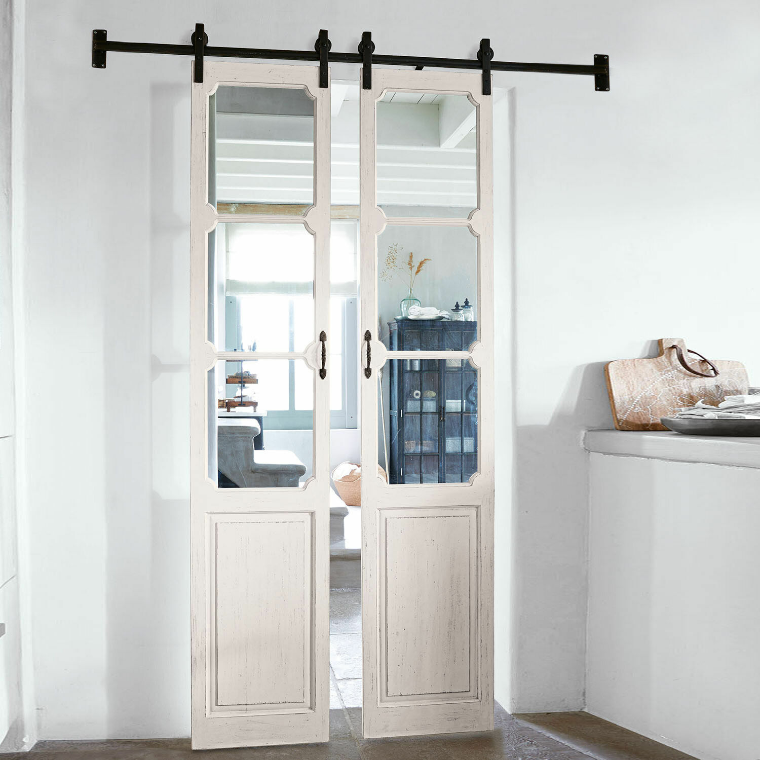 Holen Sie sich mit diesem malerischen Schiebetür-Duo ein ganz besonderes Schmuckstück nach Hause: Es wirkt wie ein echtes Meisterstück aus der Hand eines Schreiners und versprüht ein rustikal-romantisches Flair, denn die Türen sind aus echtem Tannen- und Kiefernholz gefertigt und mit einem faszinierenden Antik-Finish versehen. Vorder- wie Rückseite sind dabei identisch. Das Material verleiht ihnen einen ganz natürlichen Charme. Für guten Halt sorgt eine massive Eisenschiene, auf der sie gleiten. Schaffen Sie sich neue Räume, bezaubernde Séparées und Refugien der Ruhe mit diesem ebenso dekorativen wie funktionalen Schmuckstück. Durch die Glasfenster kommt auch noch Licht in den dahinterliegenden Raum. Diese schöne Doppelflügeltür macht sich als Durchgangstür zum Beispiel zwischen Wohnzimmer und Küche oder Flur und Arbeitszimmer hervorragend. Mit einer stilsicheren Gestaltung Ihrer Innenräume schaffen Sie sich so perfekten Wohnkomfort.
