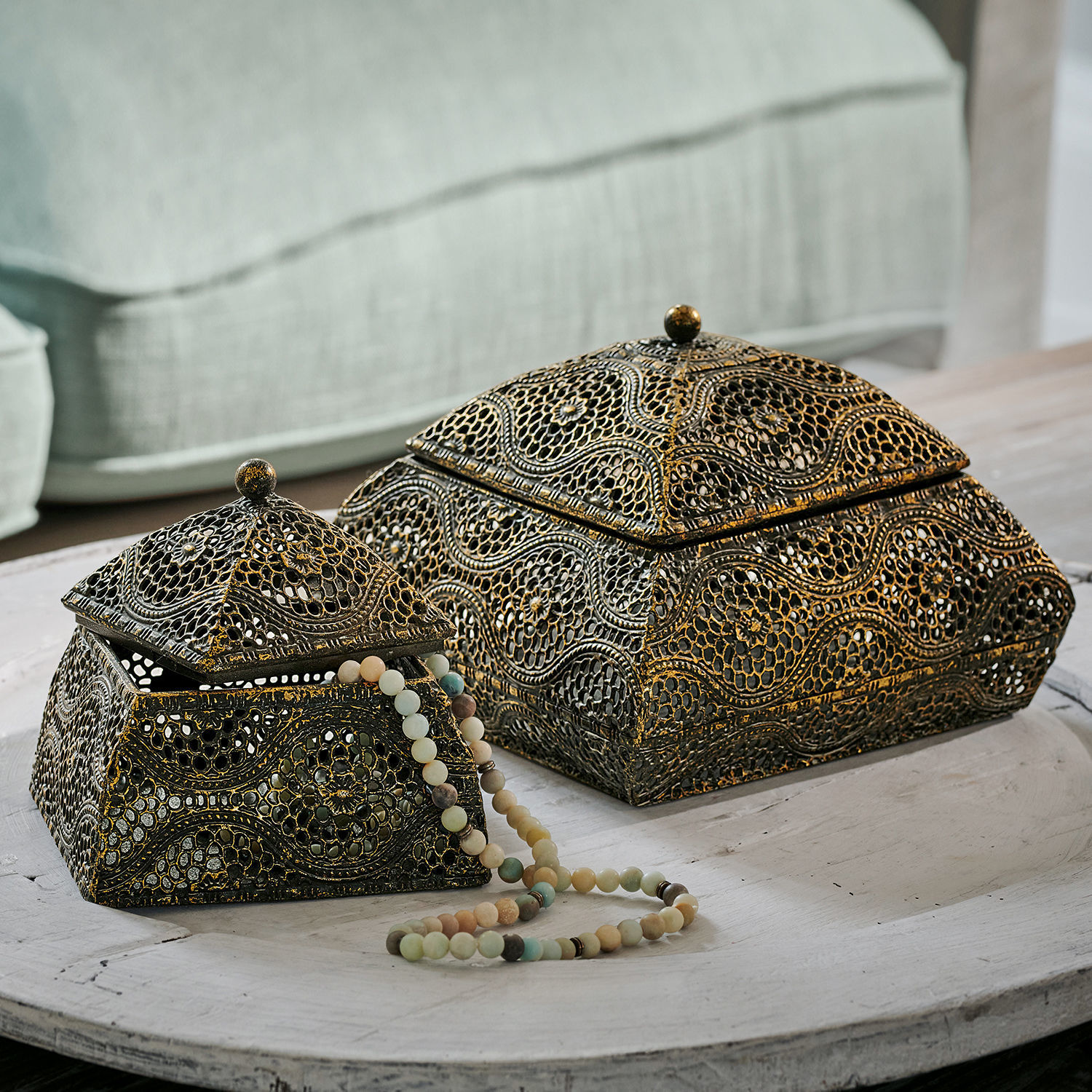 Freuen Sie sich auf ein kunstvolles Boheme-Design mit antiker Note. Die beiden reizenden Dosen bestehen aus Stahl mit feiner Verzierung. Sie haben je einen Deckel und kommen als Set in zwei Größen zu Ihnen. Der exotische Charakter erinnert an ferne Länder unter südlicher Sonne. Träumen Sie sich bei diesem Anblick in einen geheimnisvollen Palast im Dschungel oder eine verwunschene Oase in der Wüste. Die eleganten, orientalisch inspirierten Dosen lassen sich sehr vielseitig nutzen, vielleicht für Schmuck, Make-up, Erinnerungsstücke oder andere kleine Accessoires. Sie adeln jeden Raum und bringen einen Hauch geheimnisvolles Flair wie aus früheren Zeiten mit sich.