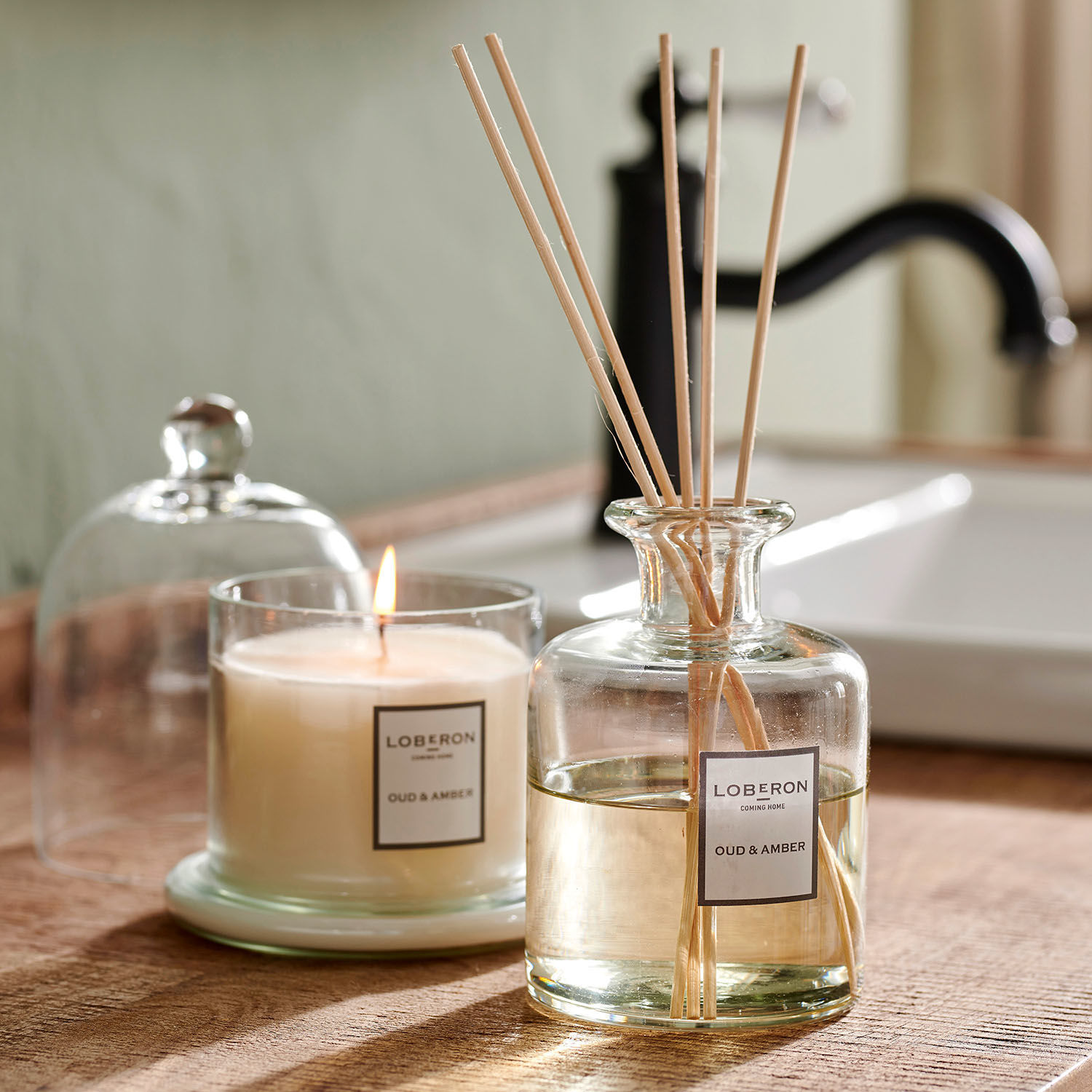 Ein traumhafter Duft und eine luxuriöse Dekoration in einem – dieses wertvolle Set ist perfekt für alle, die edle Düfte lieben. Erleben Sie eine stilvolle Duftkomposition, die jeden Raum in eine traumhafte Duftwelt entführt. Dabei spielen zwei Duftspender die Hauptrolle: Die stilvolle Duftkerze hat eine schmückende Glas-Cloche, der Raumduft mit Stäbchen ist in einem hübschen, gläsernen Behälter untergebracht. Der Flüssigduft wird in einem separaten Behälter geliefert und kann daher individuell portioniert werden. Alle Glasbehälter sind mundgeblasen und mit einem LOBERON-Print verziert. Ein tolles Set mit geschmackvollem Akzent und auch eine sehr gute Geschenkidee. Die hölzernen Duftstäbchen geben den Duft kontinuierlich und dosiert ab, während die Kerze für romantisches Licht und ein Dufterlebnis zugleich sorgt. Die perfekte Wahl für das Schlafzimmer, im Bad oder im Wohnzimmer und wirklich ein Erlebnis für alle Sinne. Derzeit gibt es unser Dufset in diesen himmlischen Duftrichtungen: Zedernholz, Oud, Ibiza und Hearth & Birch.