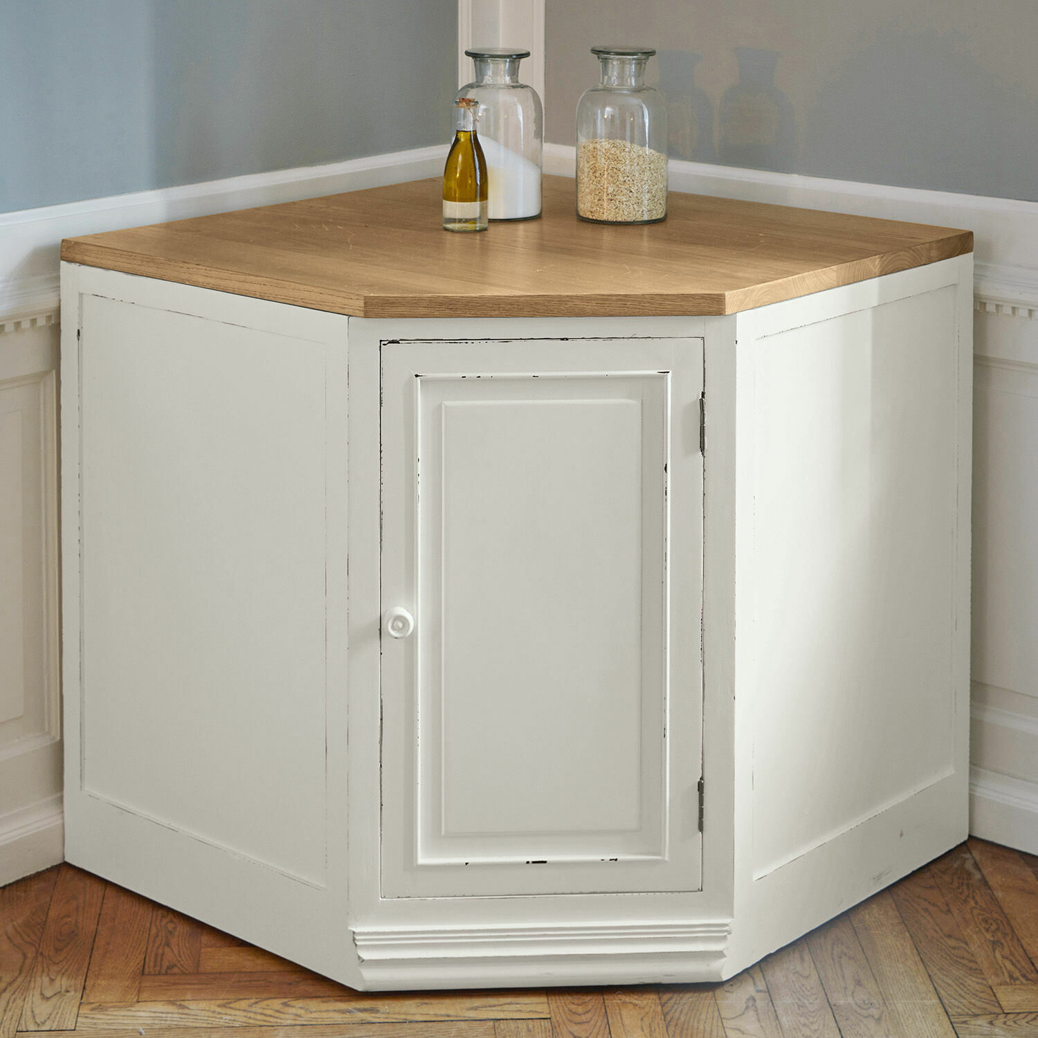 Stauraum kann man nicht genug haben in der Küche. Vor allem, wenn Sie jemand sind, der mit Leidenschaft am Herd und am Backofen steht und viele Pfannen und Töpfe sowie andere Kochutensilien zur Kreation seiner kulinarischen Köstlichkeiten braucht. Und oftmals nicht weiß, wo alles verstaut werden soll. Die Lösung ist ebenso einfach wie genial: in der Ecke. Beziehungsweise in diesem Schrank, der eine vielleicht bisher ungenutzte Ecke in der Küche als Stauraum erschließt. Denn nach vorne zeigt der Schrank zwar nur eine einzige Tür, dahinter aber erstreckt sich auf zwei Ebenen eine üppige Ablagefläche für alles, was bisher noch keinen perfekten Platz gefunden hat. Und so raffiniert diese Ecklösung ist, präsentiert sich der Schrank darüber hinaus auch im traditionellen Landhaus-Look, der beste Funktionalität mit einem charmanten Äußeren verbindet. Neben den typischen Kassettenprofilen, dem klassisch gearbeiteten Sockel und dem liebenswerten Antik-Finish wird auch die Ulmenholzplatte als Blickfang wirken, denn mit ihrem warmen Naturton und der markanten Maserung verleiht sie dem Schrank eine wohnliche Note. Dieser Eckschrank lässt sich ausgezeichnet mit den Küchenmodulen (20663, 20665, 20666, 20669) kombinieren und lässt sich Ihre Küchenzeile auf Wunsch um die Ecke führen.