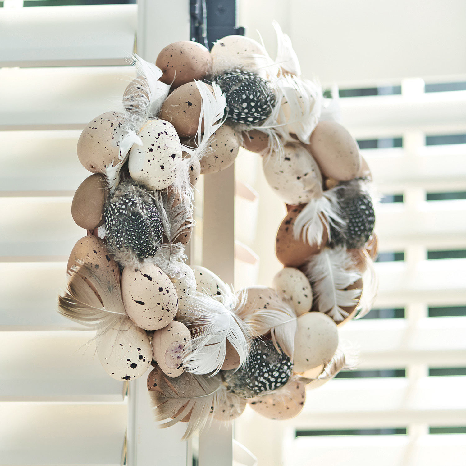 Dieser attraktive Osterkranz kombiniert bezaubernde Naturfedern mit hochwertigen Repliken, die echten Eiern täuschend ähnlich sehen. Die Eier erinnern optisch an süße, kleine Wachteleier mit unterschiedlichen Farbsprenkeln. Die rundum verteilten Hühnerfedern passen so einfach perfekt dazu und ergänzen auf die Weise einen wunderschönen Osterkranz. Das handgearbeitete Schmuckstück ist die perfekte Frühlingsdekoration für Türen, Wände und Fenster. Die Eier sind nicht bunt bemalt, sondern in einer naturbelassenen Optik gehalten. Dadurch wirkt der Kranz sehr dezent, stilvoll und unaufdringlich. Er fügt sich also nahtlos in bereits bestehende Oster-Dekorationen ein, ohne anderen Accessoires die Show stehlen zu wollen.