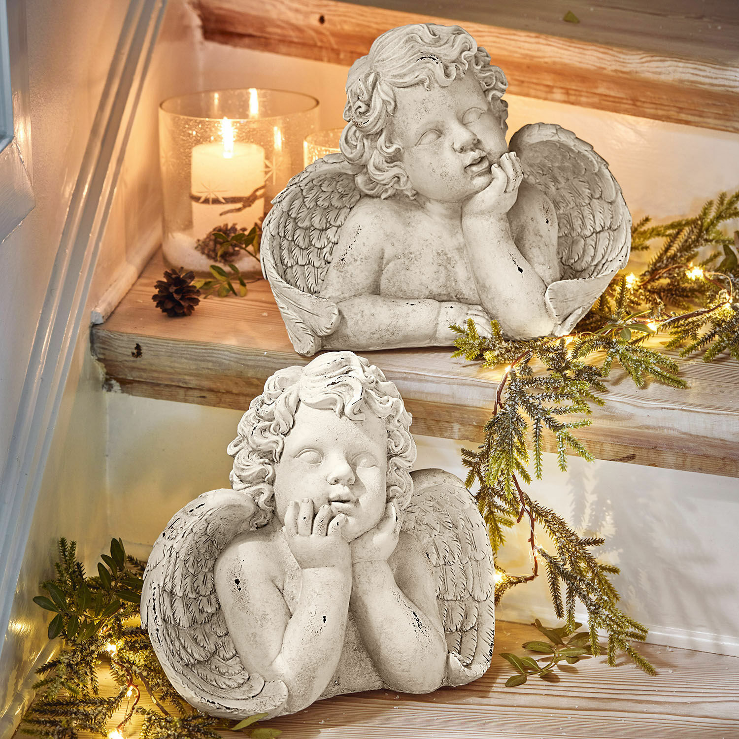 Diese beiden reizenden Himmelsboten versprühen eine sehr friedliche und angenehme Atmosphäre. Sie sind detailreich gearbeitet und bestehen aus Polyresin mit Antik-Finish. Erleben Sie ein harmonisches Duo aus zwei Engelchen mit freundlichen Gesichtern, welches geradezu himmlisches Flair in Ihr Zuhause bringt. So können Sie sich auf Wunsch das ganze Jahr über an diesem friedvollen Deko-Akzent freuen, der im Regal, auf einer Kaminkonsole oder auch einer Anrichte platziert eine gute Figur macht. Die süßen Engelchen passen sehr gut zu einem Ambiente im Shabby-Chic und bringen einen Hauch Romantik in Ihr Heim.