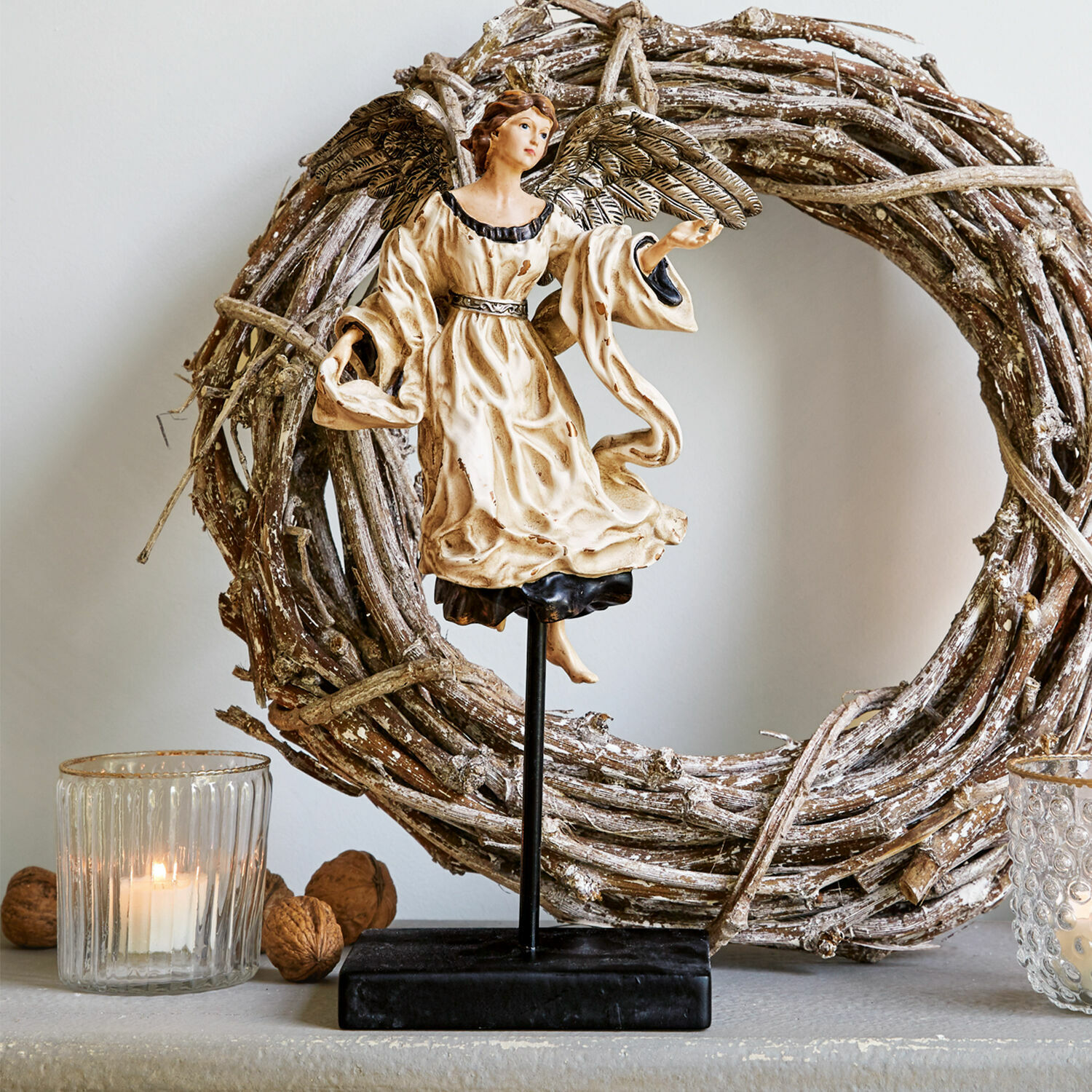 Nichts repräsentiert die weihnachtliche Stimmung des Christfestes so sehr wie ein Engel. Der Himmelsbote ist das wunderbare Symbol für die frohe Botschaft und den Geist der Weihnacht. Er ist in jeder Kirche zu finden und darf in der Adventszeit und am Heiligen Abend auch im eigenen Haus nicht fehlen. Seine himmlische Schönheit findet ihre greifbare Form in dieser kunstvollen Figur, die sicherlich eines der Highlights Ihrer festlichen Dekoration wird. Sie ist vollständig aus robustem Polyresin und fest auf ihrem edlen Ständer befestigt, der zu hundert Prozent aus hochwertigem Eisen besteht. Seine enorme Detailtiefe fesselt den Blick: Die fein strukturierten Flügel, die aus dem Rücken ragen, das mit zahlreichen realistischen Falten versehene, fallende Gewand und die stilisierten Haare sind nur ein paar Beispiele für die grandiosen Feinheiten, die diesen Engel zu einem kleinen Kunstwerk machen.