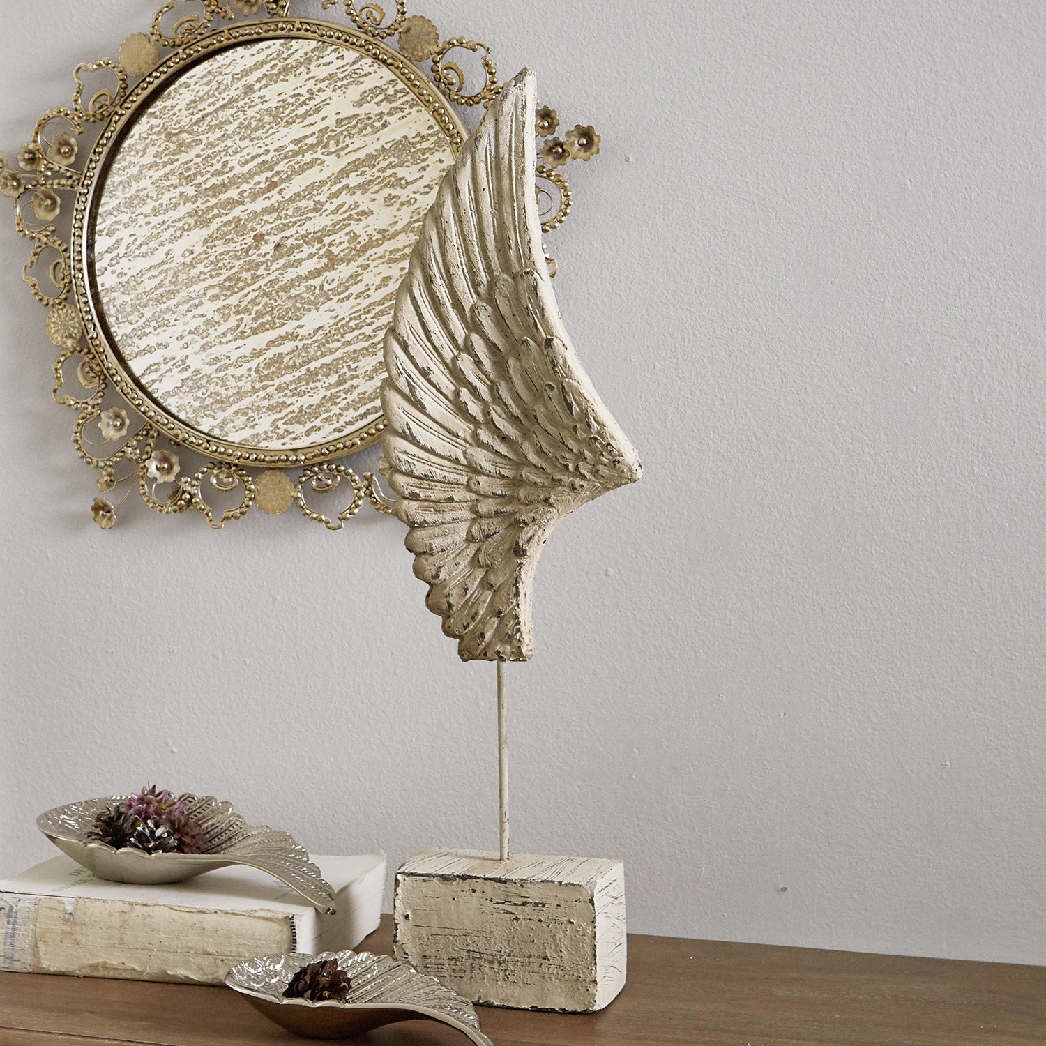 Geradezu ein himmlisches Deko-Objekt: Der wunderschöne Deko-Flügel aus Zement mit Antik-Finish ist liebevoll von Hand gearbeitet. Er schwebt fast auf einem eisernen Fuß und bringt eine Prise Romantik und Verträumtheit in jedes Ambiente. Der Flügel setzt beispielsweise zum Shabby-Chic einen wundervollen Akzent. Ein wenig erinnert der Flügel an einen himmlischen Gruß – ausgesprochen schön und geschmackvoll.