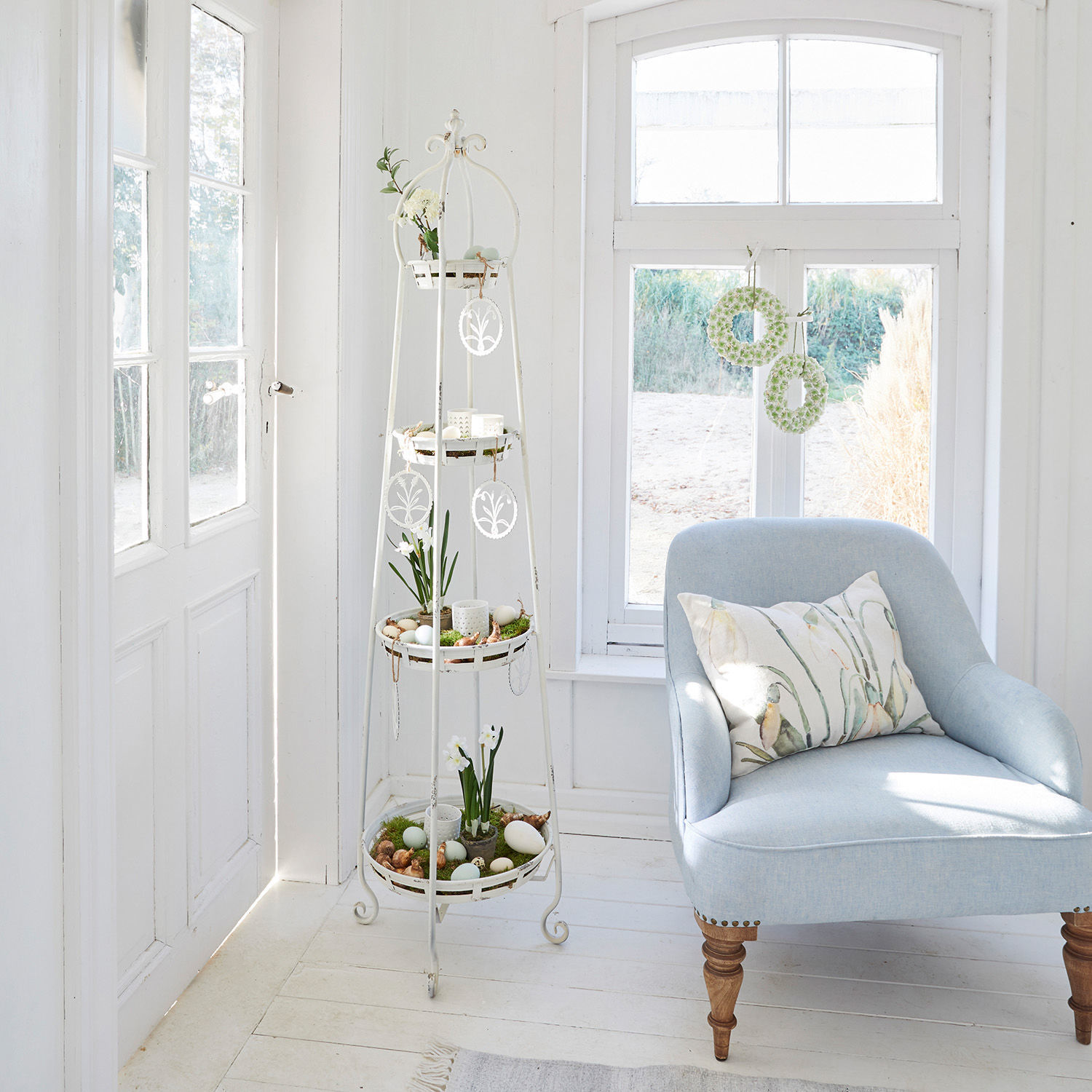 Nicht nur wunderhübsch, sondern auch vielseitig präsentiert sich diese dekorative Etagere in französischem Landhausstil. Das mehrstöckige Design ermöglicht es, unterschiedliche Leckereien und Snacks stilvoll auf kleinster Fläche zu präsentieren. Natürlich kann das schöne Stück auch im Badezimmer verwendet werden, beispielsweise um Ihre Beauty-Accessoires zu organisieren. Im Eingangsbereich Ihres Zuhauses können Sie die Etagere wiederum nutzen, um Handschuhe, Schlüssel und weitere Utensilien in Griffweite zu lagern. Doch am schönsten wirkt sie, wenn Sie sie saisonal nach Belieben dekorieren. Mit Tannengirlanden und Lichterketten zu Weihnachten, mit Ostereiern und Hasen zu Ostern oder mit anderen Accessoires, die Ihre Wohnung noch heimeliger machen. Genießen Sie dieses mehrstöckige Design aus Eisen mit einem wunderschönen Antik-Finish.
