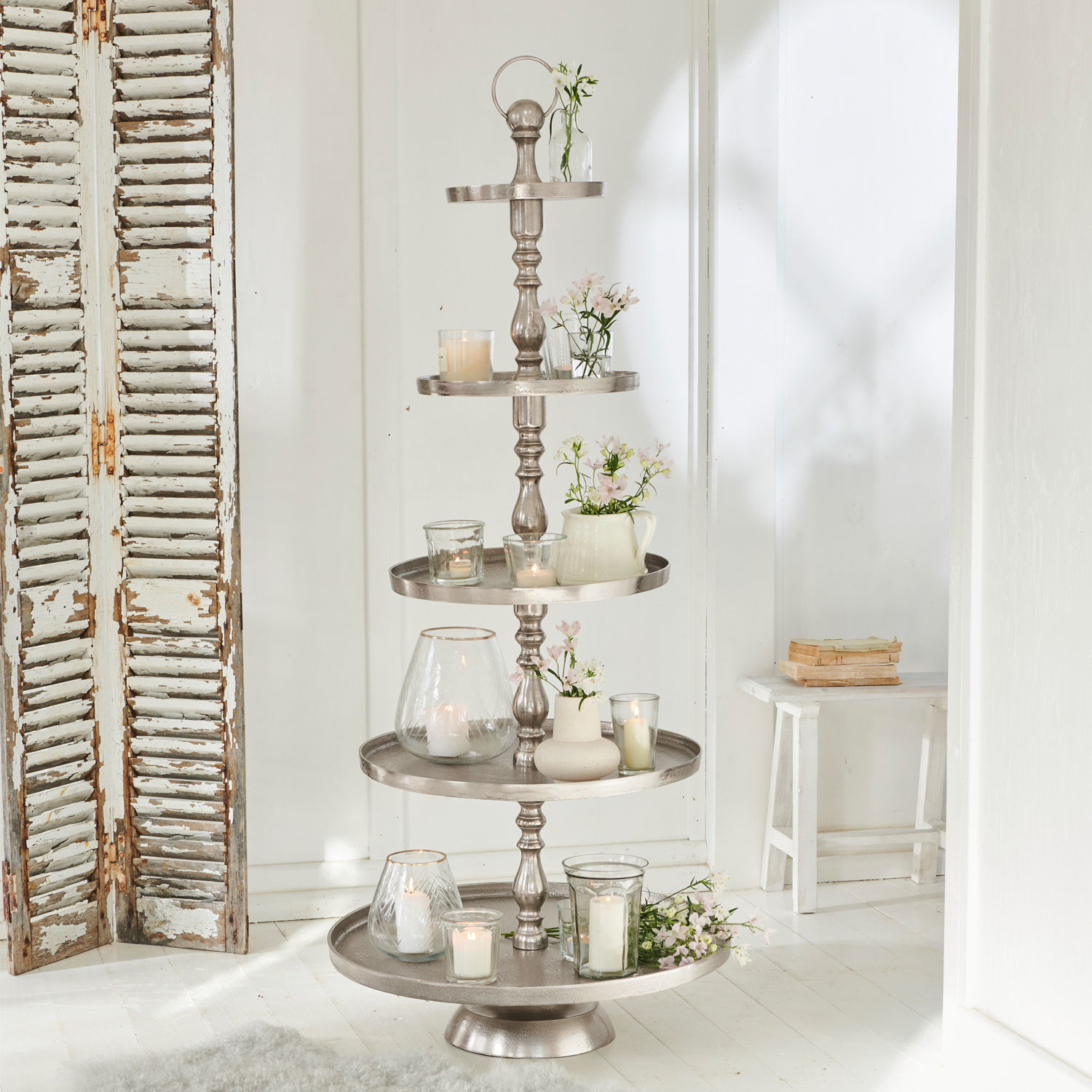 Diese fünfstöckige Etagere zieht die Blicke nicht nur aufgrund ihrer imposanten Höhe von 1,5 Metern magisch an. Sie ist aus reinem Aluminium gegossen und geizt nicht mit handgearbeiteten Finessen. Das eindrucksvolle Stück ist mit einem hochwertigen Antik-Finish überzogen, das einen eleganten Silberschimmer auf die Oberfläche zaubert. Die unterschiedlich dimensionierten Teller verfügen über einen leicht erhöhten Rand, damit nichts herunterfallen kann. Und weil sie mit einem Abstand von etwa 30 Zentimetern montiert sind, finden die unterschiedlichsten, größeren Deko-Objekte platzt. Beispielsweise können Sie die Etagere mit einer LED-Girlande umwickeln oder mit Pflanzen, Figuren und Kerzen schmücken. Dank der Größe kann diese Etagere auch einen klassischen Weihnachtsbaum erstzen. Ihrer Fantasie sind wirklich keine Grenzen gesetzt. Und bei Nichtgebrauch lässt sich die Etagere mit wenigen Handgriffen zerlegen.