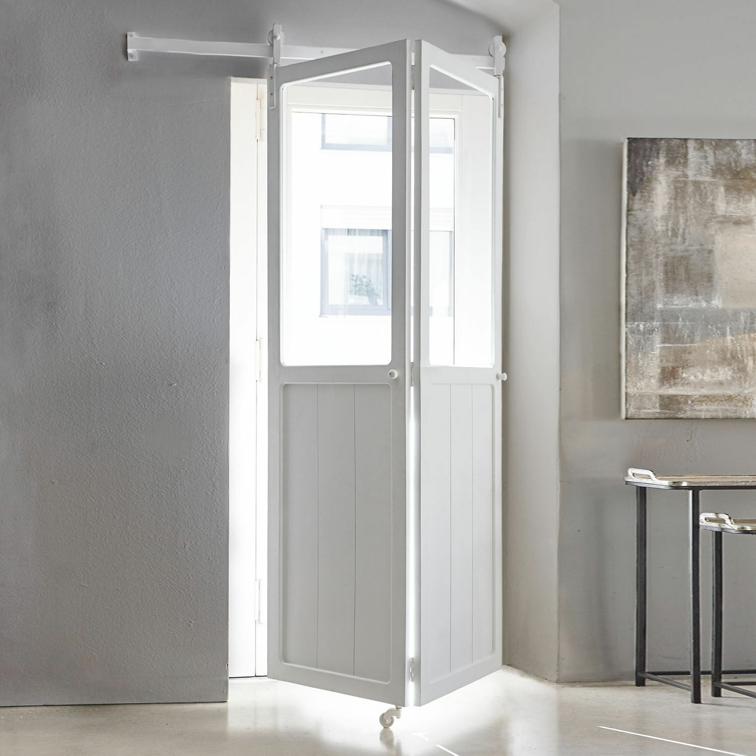 Sie möchten ab und zu einfach Ihre Ruhe haben? Sich ungestört von der Familie zurückziehen, um eine kleine private Auszeit zu genießen und dann innerlich gestärkt wieder am Familienleben teilzunehmen? Oder haben Sie sich in der Wohnung ein Home-Office eingerichtet, das Sie aber nicht mit einer fest eingebauten Tür verschließen möchten? In jedem dieser Fälle – und noch in ein paar weiteren – ist eine Falttür die perfekte Lösung. Mit einer Falttür können Sie bei Bedarf ein Séparée abtrennen und mit einem Handgriff wieder öffnen. Denn die Falttür ist oben sicher an einer stabilen Eisenschiene befestigt und unten mit praktischen Rollen ausgestattet. Möchten Sie Ihre kleine private Oase öffnen, falten sich die beiden Flügel wie von Zauberhand zusammen, während die Falttür oben sicher auf/in der Schiene gleitet. Auf diese Weise braucht eine geöffnete Falttür auch deutlich weniger Platz an der Wand als zum Beispiel eine Schiebetür. Darüber hinaus ist dieses Modell auch noch ein Schmuckstück im Raum. Im modernen Landhaus-Look aus edlem Mangoholz gefertigt, bietet es außerdem den Vorzug, dass durch die beiden Fenster Licht in den Raum fällt.