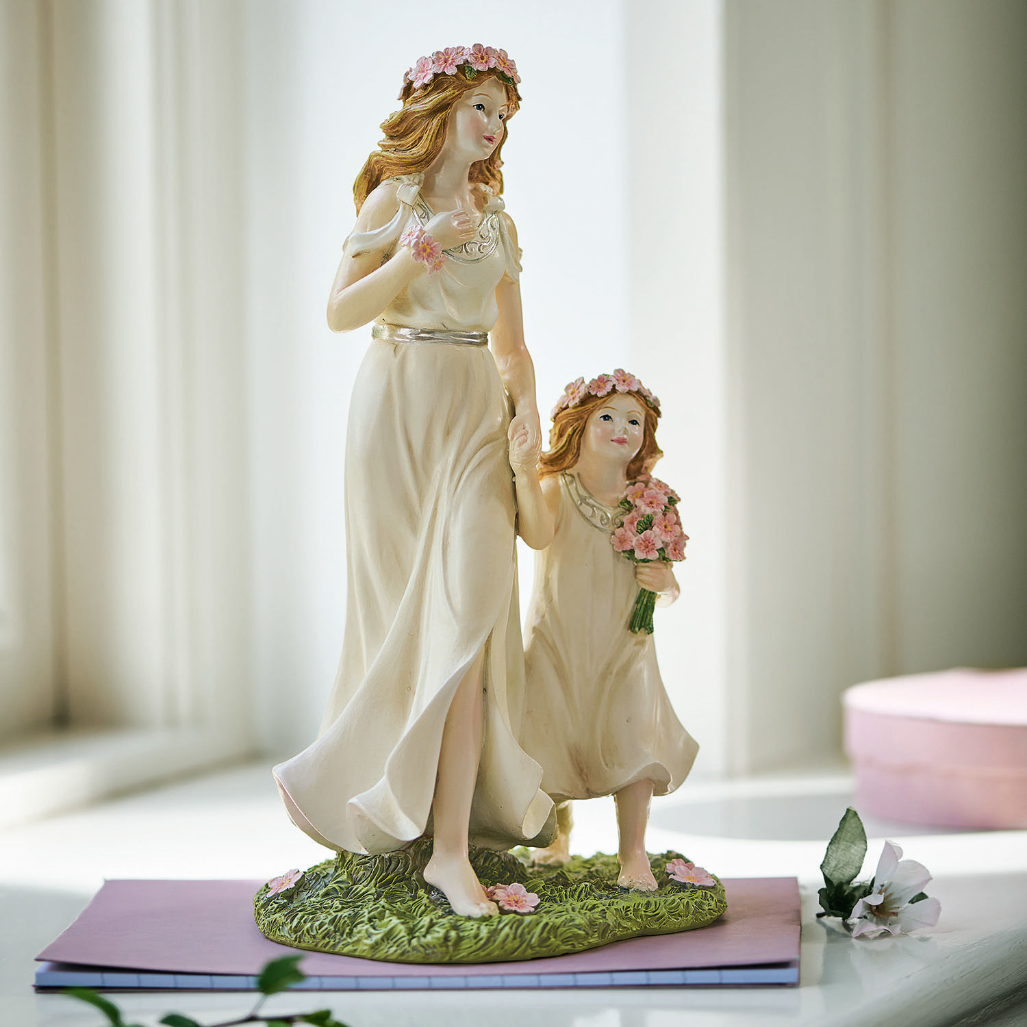 Wie ein verspielter Frühlingstraum – diese beiden wunderschönen Figuren versprühen pure Romantik. Das nostalgische Design bezaubert mit sehr detailverliebter Gestaltung und feiner Handbemalung. Das edle Accessoire aus Polyresin stellt eine junge Dame mit einem niedlichen, kleinen Mädchen dar. Sie haben sich mit Blüten geschmückt, in weiße Kleider gehüllt und scheinen über eine Blumenwiese zu schweben – beinahe wie Märchenfeen. Der Anblick lädt zum Träumen ein und setzt einen tollen Akzent zum Shabby-Chic. Verzieren Sie hiermit das Regal, die Fensterbank oder schmücken Sie mit dem schönen Design den Tisch, und freuen Sie sich auf pure Nostalgie.