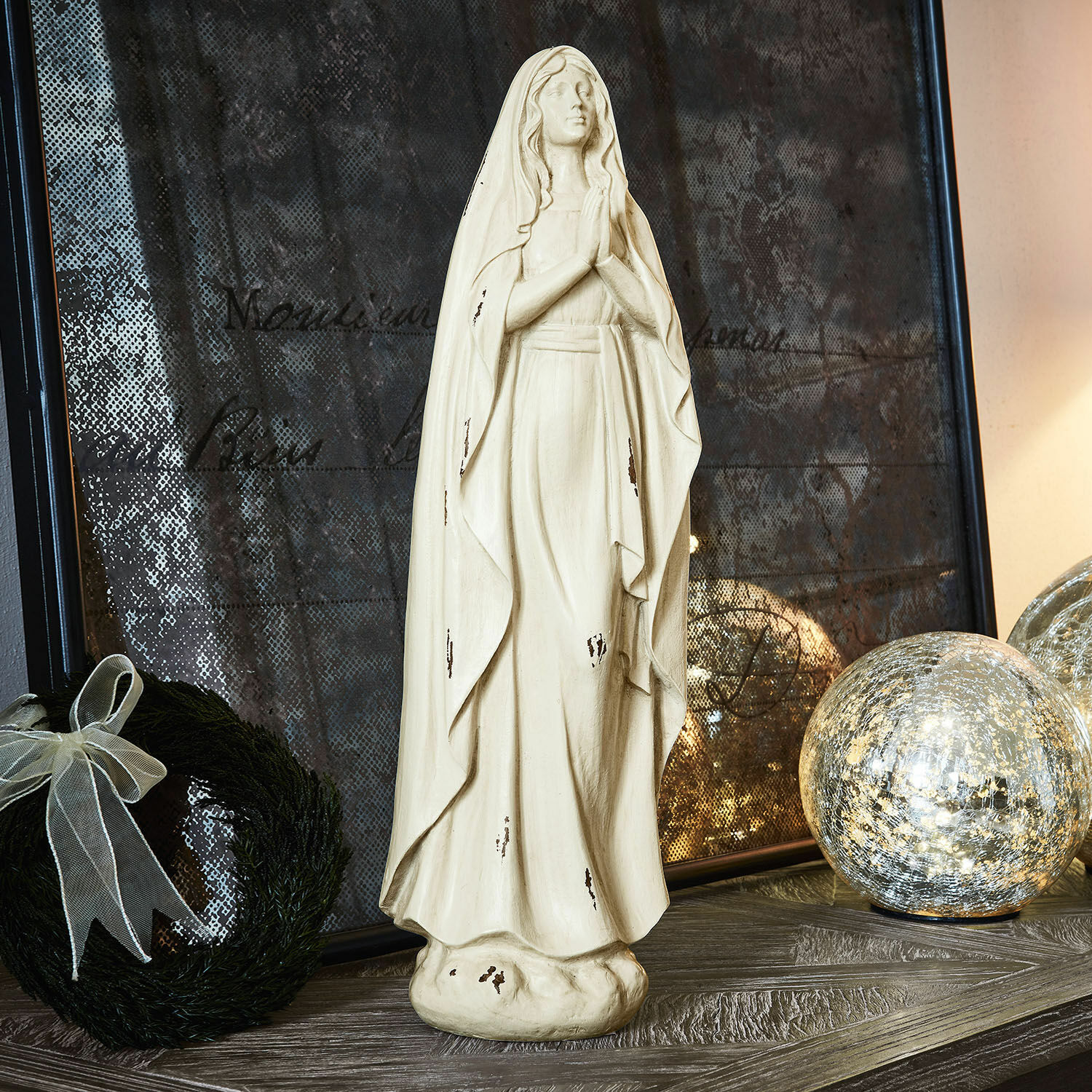 Diese wunderhübsche Statue ist im Stil einer nostalgischen Heiligenfigur gehalten und sehr detailreich gearbeitet. Sie besteht aus Polyresin mit Antik-Finish und zeigt eine betende Dame, welche auch eine Heilige sein könnte. Das edle Accessoire strahlt viel Ruhe und Frieden aus – es ist das ganze Jahr über eine Bereicherung. Diese reizende Statue ziert sehr stilvoll eine Kaminkonsole oder ein Regal. Sie passt wunderbar zum Shabby-Chic und erinnert uns auch im vielleicht einmal hektischen Alltag daran, für einen Moment einzukehren und uns zu besinnen. Diese beruhigende Ausstrahlung und die zeitlose Optik machen das ästhetische Design zu einer echten Bereicherung für jeden Raum.