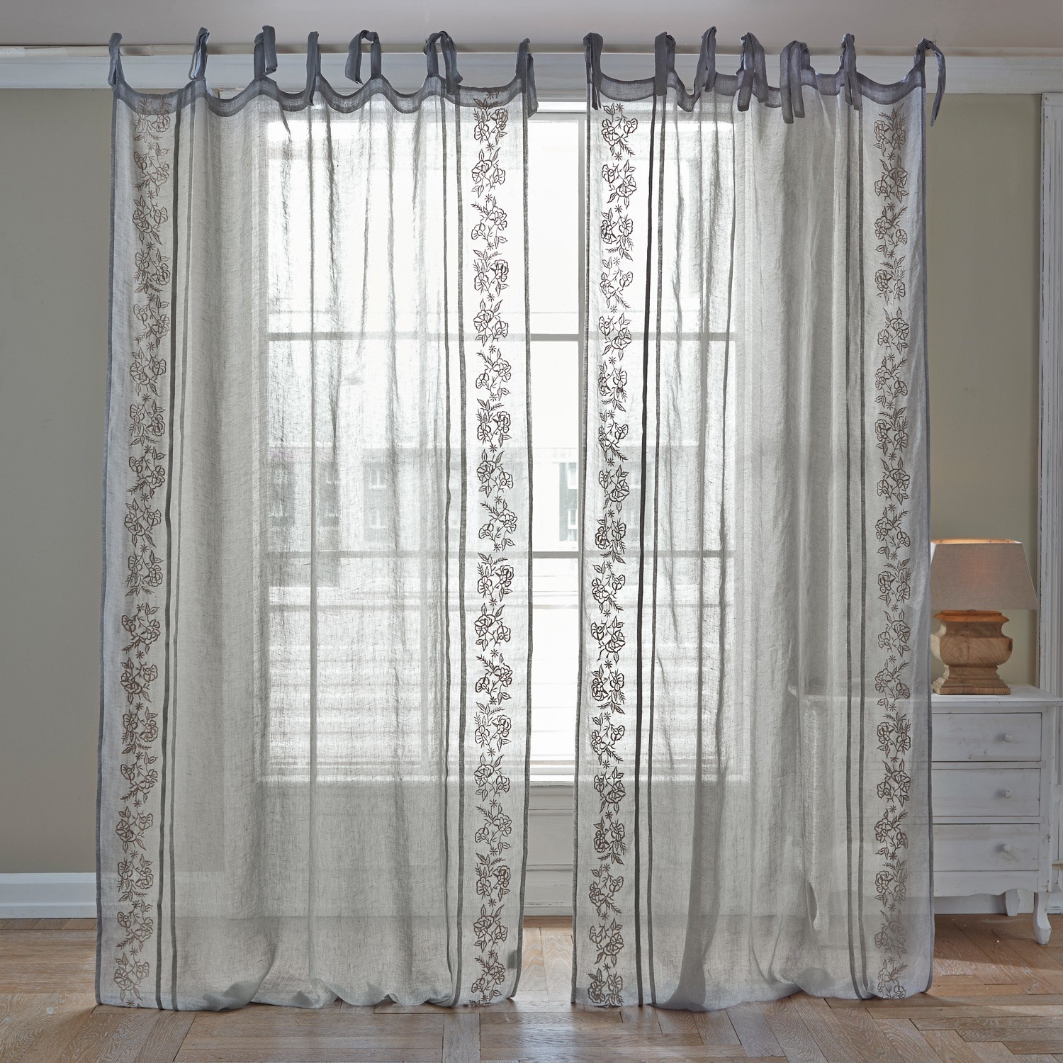 Die hochwertige Gardine aus reinem Leinen überzeugt mit floralen Stickereien an den Längsseiten, einer lichtdurchlässigen Qualität und einer kombinationsstarken Farbgebung. Dank der Bindebändchen oben können Sie können sie einfach um jede Gardinenstange binden. Ein weiterer Vorteil der Bänder ist, dass Sie die Länge des Vorhangs ein wenig variieren können.