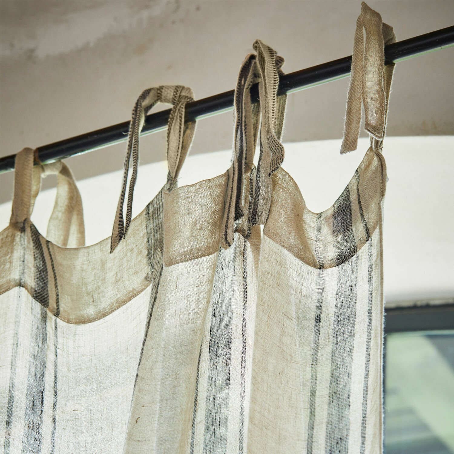 Gardinen sind so viel mehr als nur Dekoration: Sie unterstreichen Ihren eigenen Stil, schaffen Räume mit Charakter und tragen entscheidend zum Wohlfühlen bei. Diese hochwertige Gardine vereint ein stilvolles Streifen-Design mit den vorzüglichen Eigenschaften von reinem Leinen. Das weich fließende Naturmaterial mit ausdrucksstarker Struktur liegt in der Welt des Wohnens nach wie vor im Trend. Das feine Gewebe lässt das Tageslicht angenehm mild durchscheinen, zugleich schützt es vor aufdringlichen Blicken und zu intensiver Sonneneinstrahlung. Das schwarze, vertikal verlaufende Streifenmuster ist aufgedruckt und bringt eine spannende Lebendigkeit in das Design. Abgerundet wird das Textil durch integrierte Bindebänder, die das Aufhängen auf die Gardinenstange besonders leicht von der Hand gehen lassen. Genießen Sie diesen Hingucker am Fenster, der mit Wohnstilen wie den Industrial-Style oder Vintage-Look wunderbar harmoniert – und Lieblingsräumen wie Ihrer Küche oder dem Wohnzimmer eine einladende Gemütlichkeit verleiht.