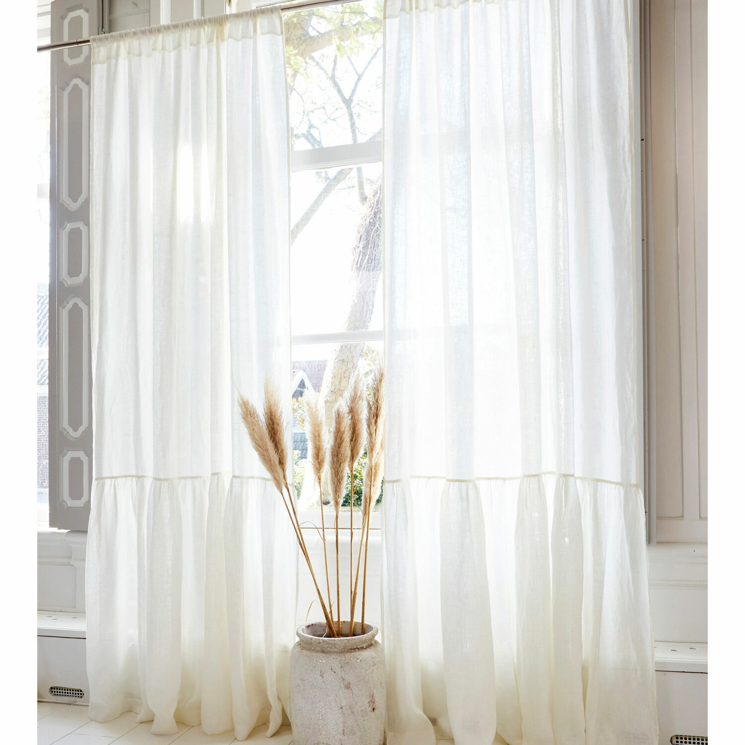 Romantik und ein stilvoller Sichtschutz ziehen mit dieser hochwertigen Gardine bei Ihnen ein. Sie hat einige besondere Details, etwa zwei Tunnelzüge, mit denen reizvolle Raffungen erzielt werden können. Benutzen Sie den unteren Tunnelzug, so können Sie den darüber liegenden Stoffteil hübsch raffen. Unten sorgt zudem Extra-Fülle für eine besonders schöne Optik. Die Extra-Fülle entsteht durch den nach unten hin weit fallenden Volant. Eine hübsche Idee, die zu einer noch hübscheren Optik führt. Die edle Gardine besteht aus reinem Leinen. Sie hat einen ansprechenden Vintage-Charakter, welcher vielen Interieurs schmeichelt. Der ansprechende Fall des Naturmaterials unterstreicht die ästhetische Optik. Hiermit treffen Sie eine sehr gute Wahl für das Arbeitszimmer oder auch Ihr Wohnzimmer und machen jeden Raum noch gemütlicher.