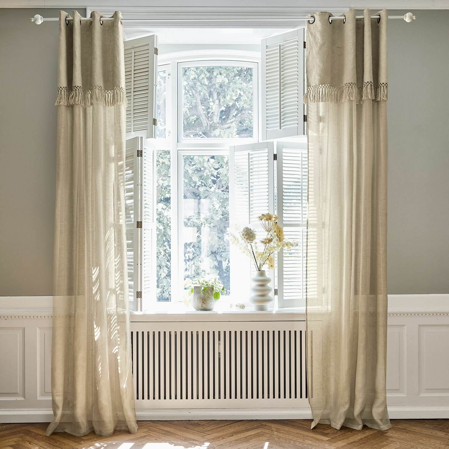 Natürlich edel, vielseitig kombinierbar und mit dem gewissen Etwas – diese hochwertige Gardine aus reinem Leinen wird dem hohen Anspruch nach einer vollkommenen Raumwirkung mehr als gerecht – und fügt sich harmonisch in viele Einrichtungsstile ein. Die unregelmäßige Struktur und der leichte Knittereffekt sind ein Echtheitsmerkmal für das Naturgewebe. Und gerade diese Eigenschaften verleihen der Gardine den individuellen, lebendigen Charakter. Vor das Fenster gezogen lässt sie das Tageslicht sanft durchscheinen und hält gleichzeitig neugierige Blicke fern. Die aufwendig gestaltete Zierborte mit Fransen setzt den schmückenden Akzent. Aufgrund der integrierten Metallringe lässt sich die Gardine ganz unkompliziert auf die Vorhangstange ziehen. Jetzt müssen Sie nur noch die wunderbare wohnliche Atmosphäre in Ihrem Zuhause genießen.
