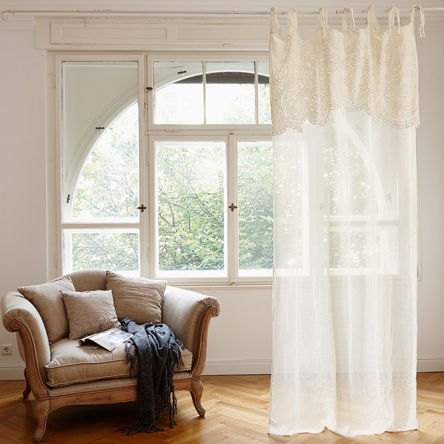 Die cremefarbene Leinengardine mit einem Volant aus fein gewebter Baumwolle und edler Richelieu-Stickerei rundet jeden Stil ab. Und: Dank der offenen Schleifenbänder wird auch das Befestigen zu einem Kinderspiel. Einfach um die Gardinenstange knoten oder eine Schleife binden – Fertig! So kann der Stoff sogar noch ein wenig in der Länge variiert werden. Schön zu einer Einrichtung im Landhaus-Stil oder in einem klassischen Ambiente.